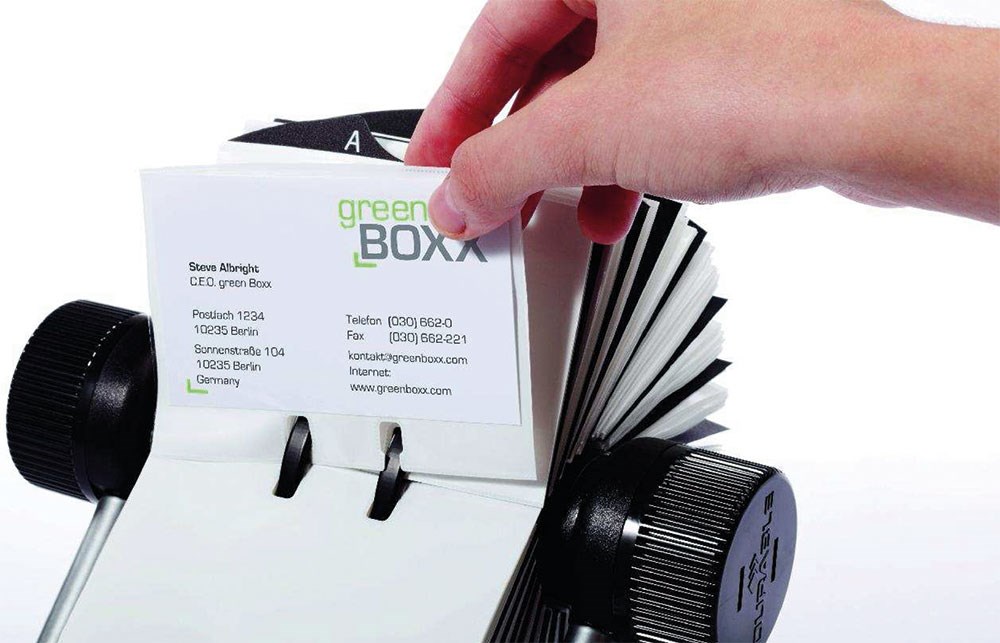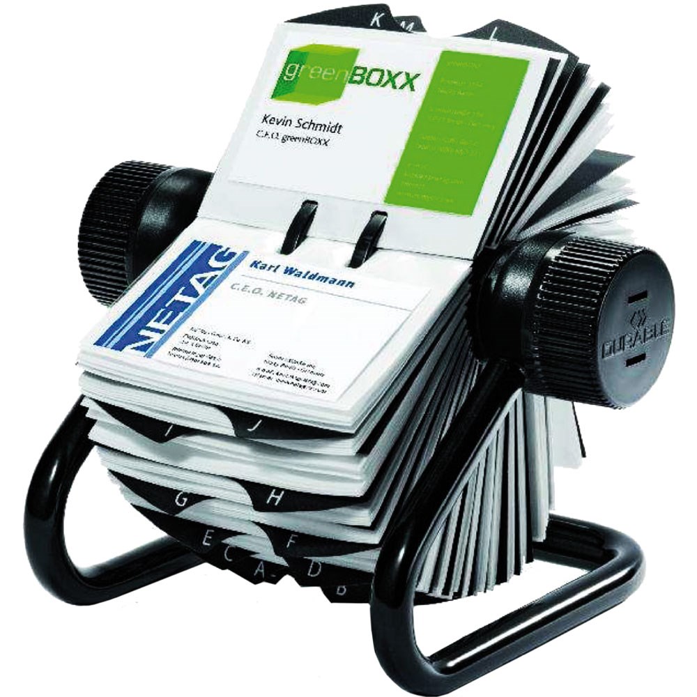 Okretni album na metalnom postolju. Sadrži 200 košuljica za umetanje 400 posjetnica max dimenzija 104x72 mm te 25-djelni abecedarij A-Z. Košuljice i abecedarij se lako vade i umeću na mjesto po želji. Lako i bezo pretraživanje zahvaljujući posebnom okretnom mehanizmu s kotačem.