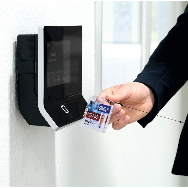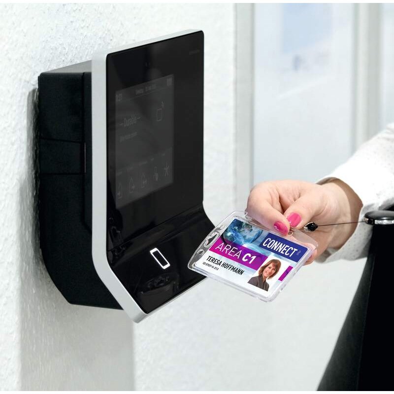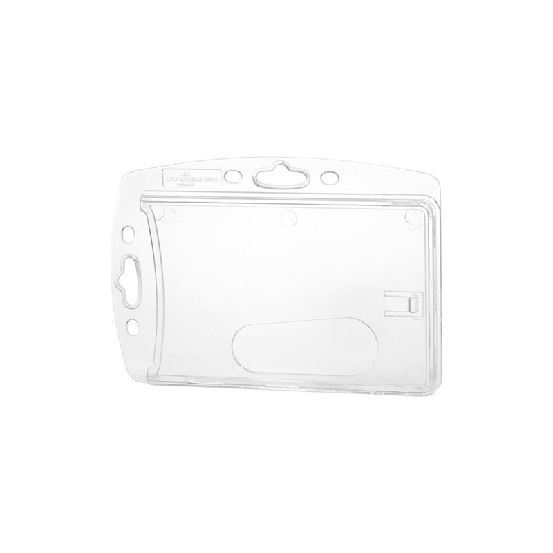 Čvrsti etui izrađen od prozirnog akrila za nošenje ID kartice. Otvor za palac za lako vađenje kartice. Utori za postavlanje kopče, kvačice, lančića i dr. Mogućnost nošenja okomito i vodoravno.