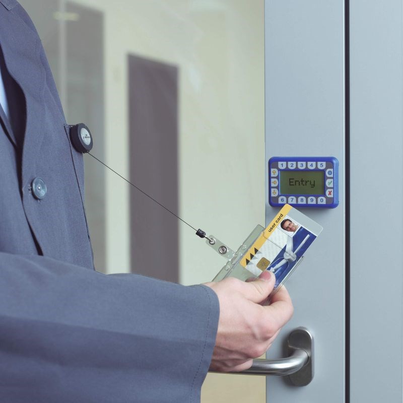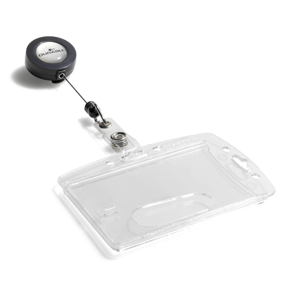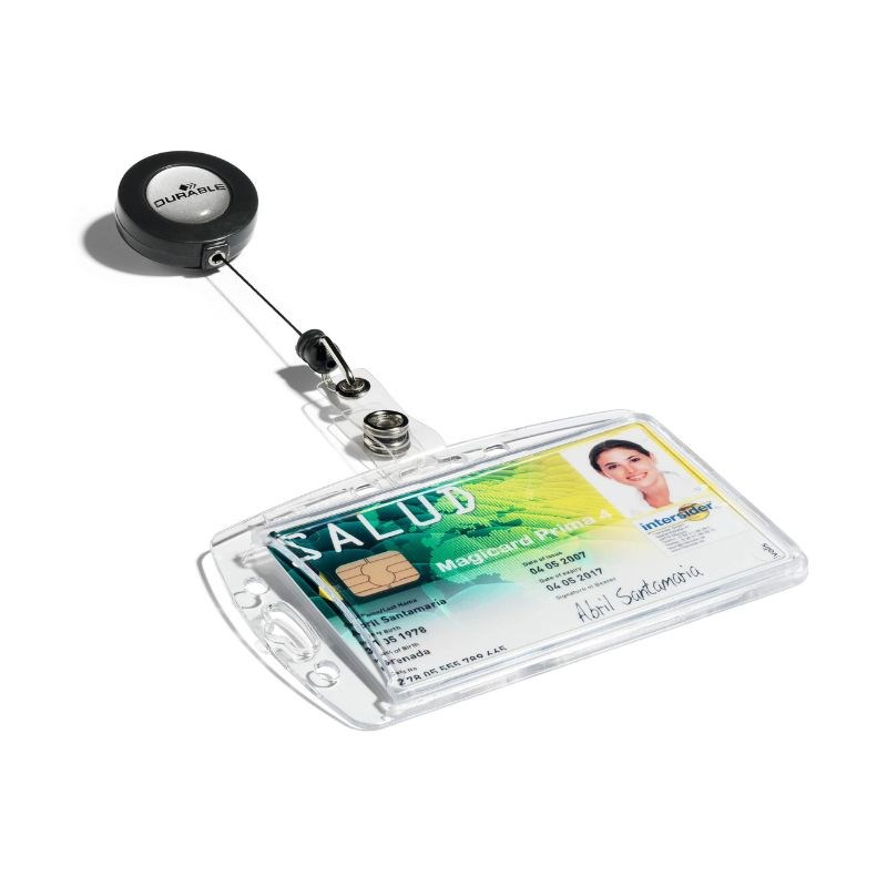 Čvrsti etui od prozirnog akrila za nošenje ID kartice s kvačicom na potezno izvlačenje dužine 80 cm. Kristalno prozirni materijal za optimalnu čitljivost i jednostavno skeniranje crtičnih kodova. Otvor za palac za lako vađenje kartice.