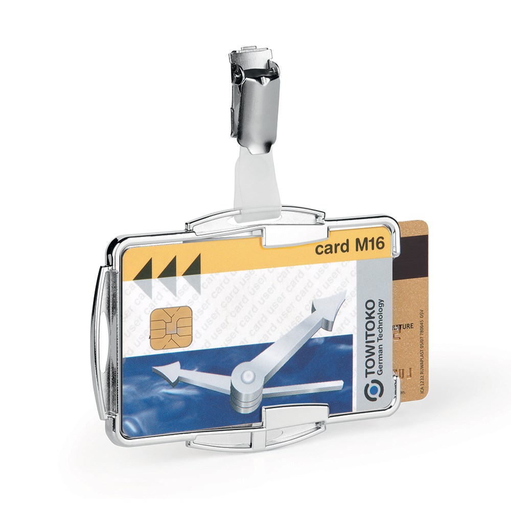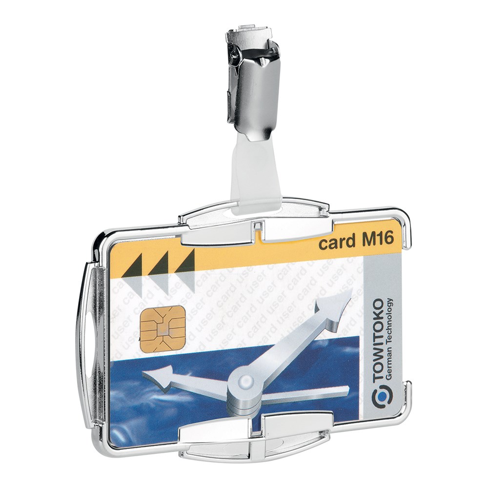 Držač ID kartice s RFID zaštitom protiv blizinskog očitavanja podataka, pruža zaštitu od 13,56 MHz (TÜV-certificirana zaštita). S rotirajućim zatvaračem, može se koristiti u portretnom ili pejzažnom formatu, kombinirati s tekstilnim lančićem ili poteznom kopčom.