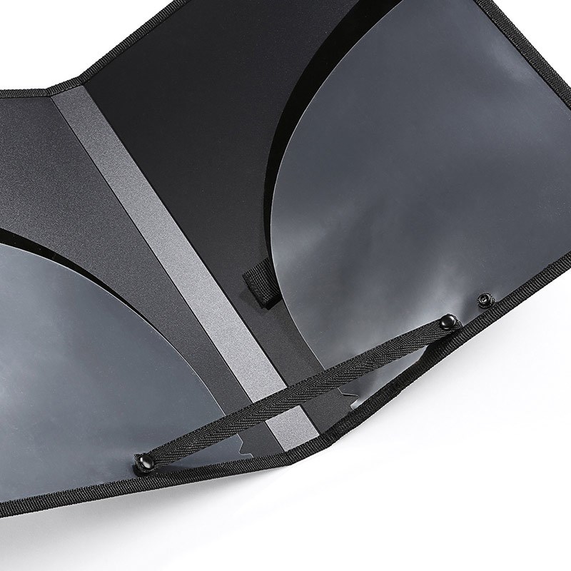 - mali remen na dnu unutarnje strane omogućuje održavanje udobnog kuta otvorenog položaja za optimalnu preglednost. Mogućnost podešavanja 2 različita kuta zahvaljujući sustavu pritisnih kopči (drukera) a također se može i ukloniti što omogućuje korištenje mape na notnom