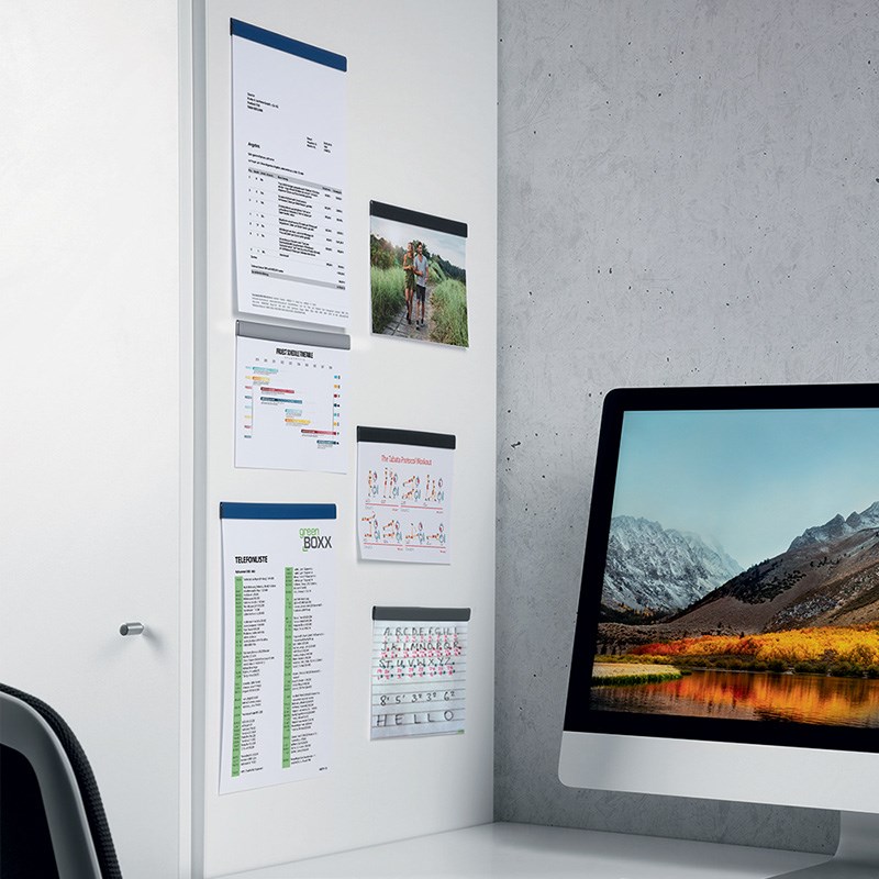 Brzo i jednostavno pričvrstite bilješke s DURAFIX®. Pričvrstite samoljepivu magnetnu klipsu, otvorite ju, stavite papir i zaklopite. Lako promijenite prema potrebi.