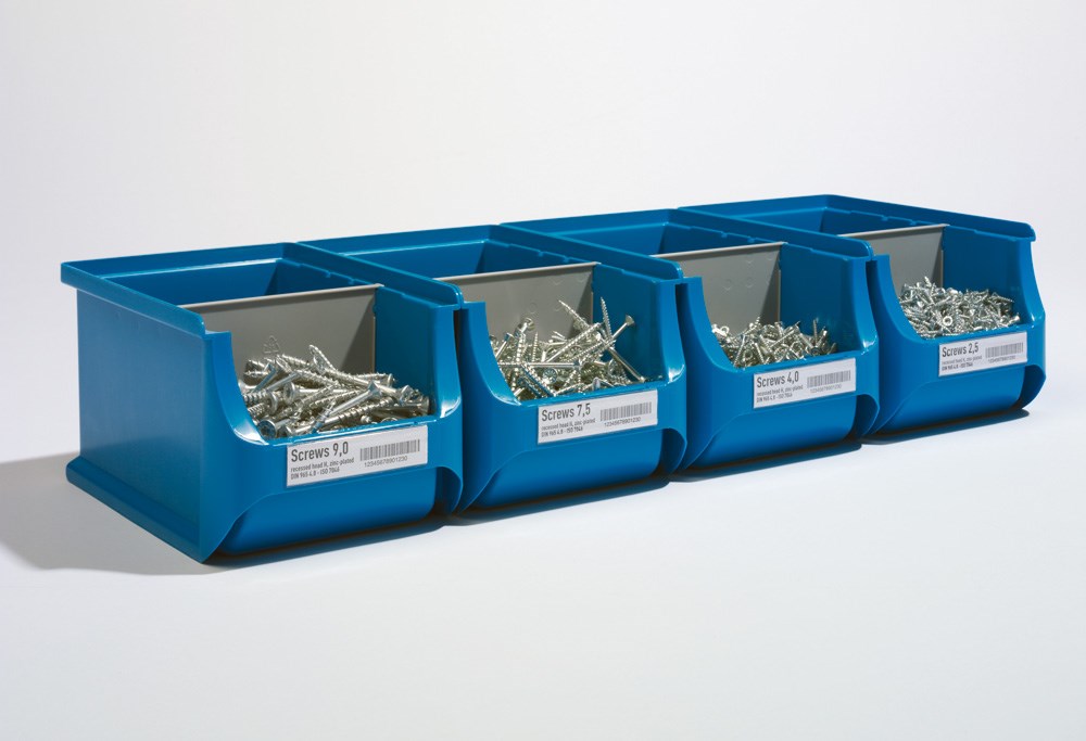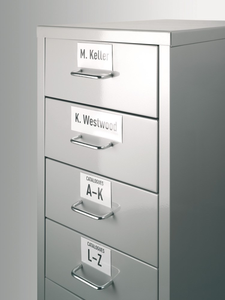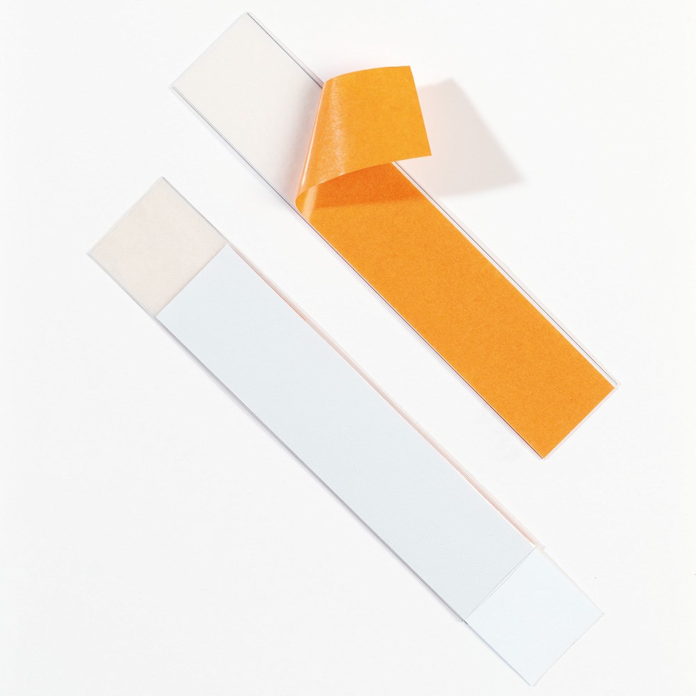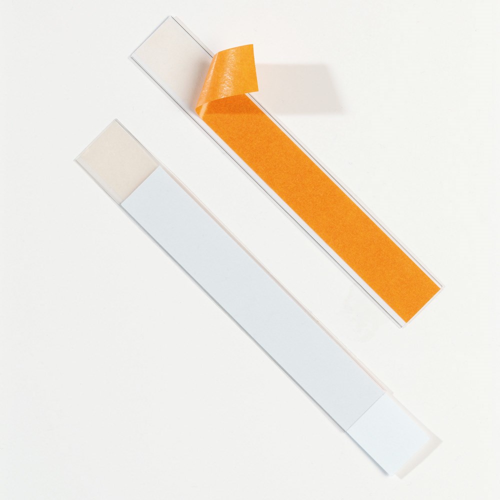Samoljepive prozirne trake za označavanje polica, ormarića, ladica, posuda,… u uredu, skladištu i kući. Trake dužine 200 mm režu se na potrebnu dužinu i zalijepe, umetanje/mijenjanje kartice sadržaja sa strane.