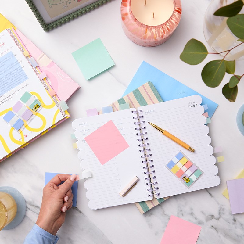 Post-it® pastelne index zastavice savršen su način da unesete red i boju u svoje bilježnice, planere, udžbenike i dokumente. Nježni pastelni tonovi plave, ljubičaste i zelene ističu važne dijelove bez da odvlače pažnju, a mat površina omogućuje pisanje kemijskom olovkom, flomasterom ili markerom. Zahvaljujući izdržljivom materijalu, zastavice se mogu višekratno premještati bez uvijanja, trganja ili gubitka ljepljivosti, što ih čini idealnima za označavanje stranica, bilježenje bilješki ili ili organizaciju po temama i prioritetima. Njihova praktična veličina omogućuje brzo i precizno označavanje, a istovremeno unosi vizualnu jasnoću i uredan, estetski efekt u svaki dokument ili planer.