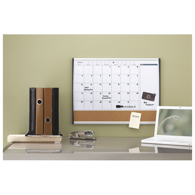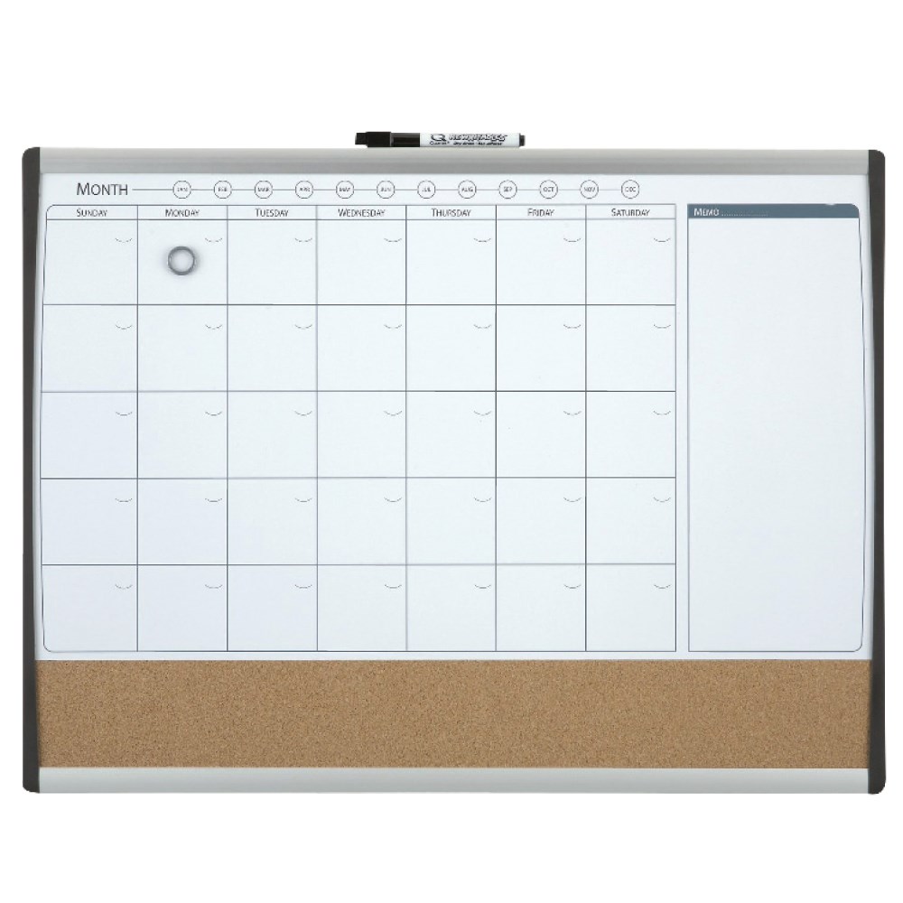 Magnetna bijela ploča za planiranje mjeseca s ucrtanim rasterom za bilješke po danima, prostorom za bilješke i plutom. Crni i srebrni plastični okvir. Pisanje whiteboard markerima.