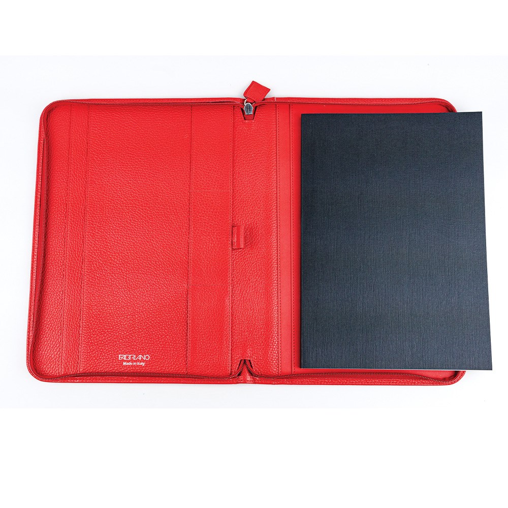 Navlaka od teleće kože obojene na bubnjem, sa dva džepa za olovke sa strane, tri utora za kredit ili posjetnice. Zatvaranje patentnim zatvaračem. Unutarnja bilježnica je Ecoqua Plus Glued točkasta.