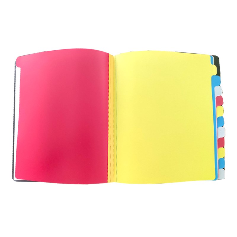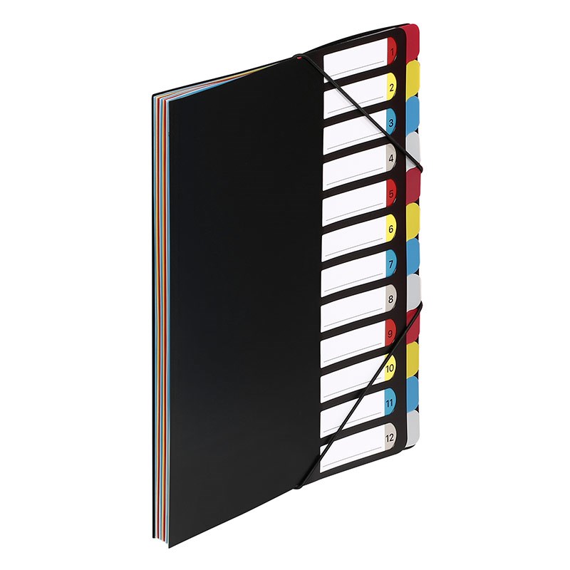 Mapa s 12 pretinaca u različitim bojama za organizaciju i pohranu dokumenata. Izrađena je od crne neprozirne plastike. Elastični kutni zatvarač pruža dovoljno prostora za pohranu dokumenata veličine A4
