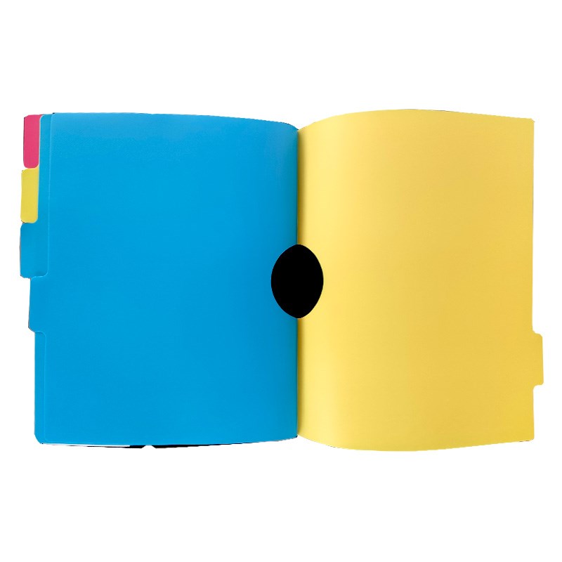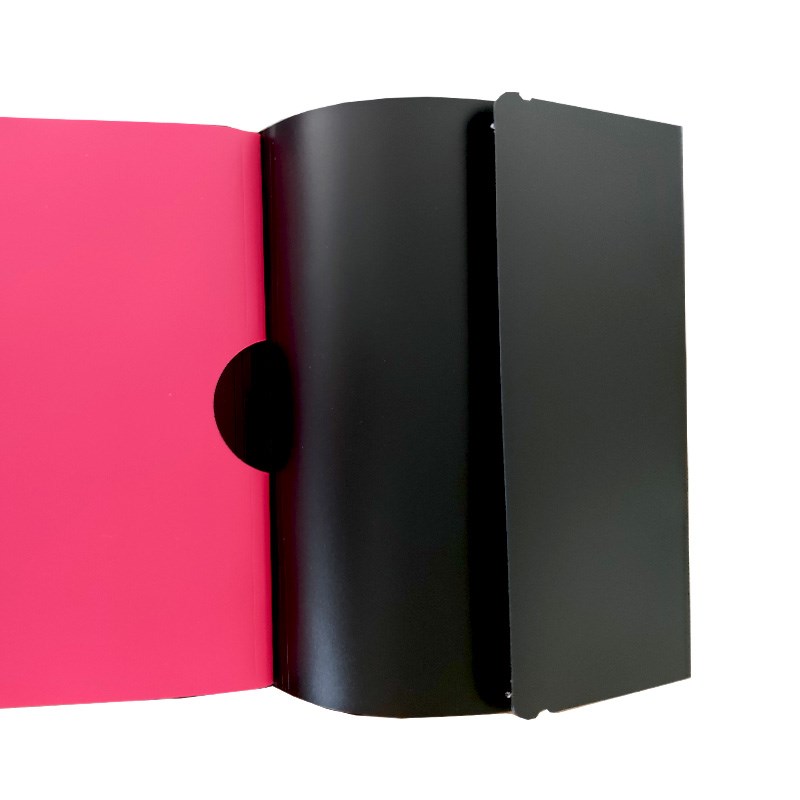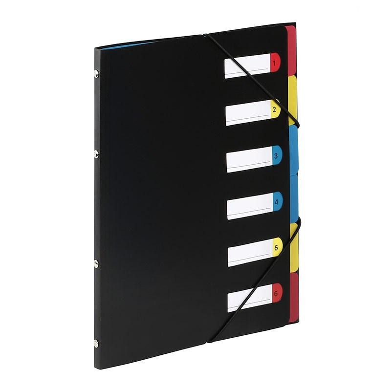 Mapa s pretincima crne neprozirne plastike i 6 pretinaca za umetanje dokumenata. Kutno zatvaranje gumicom.