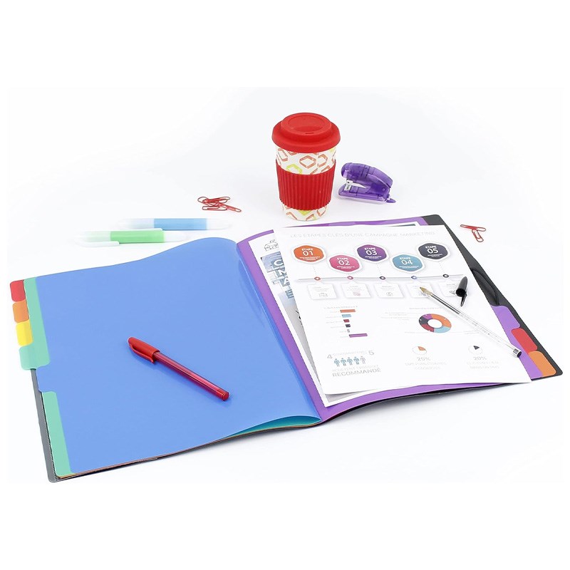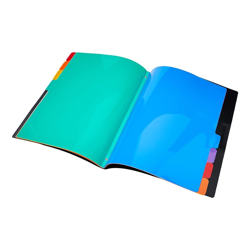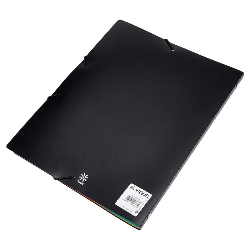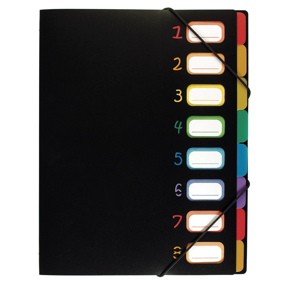 Mapa A4 s 8 pretinaca za odlaganje i razvrstavanje dokumenta, bočne indeks zastavice, prostor za upis sadržaja pretinca. Izrađena od polipropilena 5/10; izvana crno, pretinci u duginim bojama.