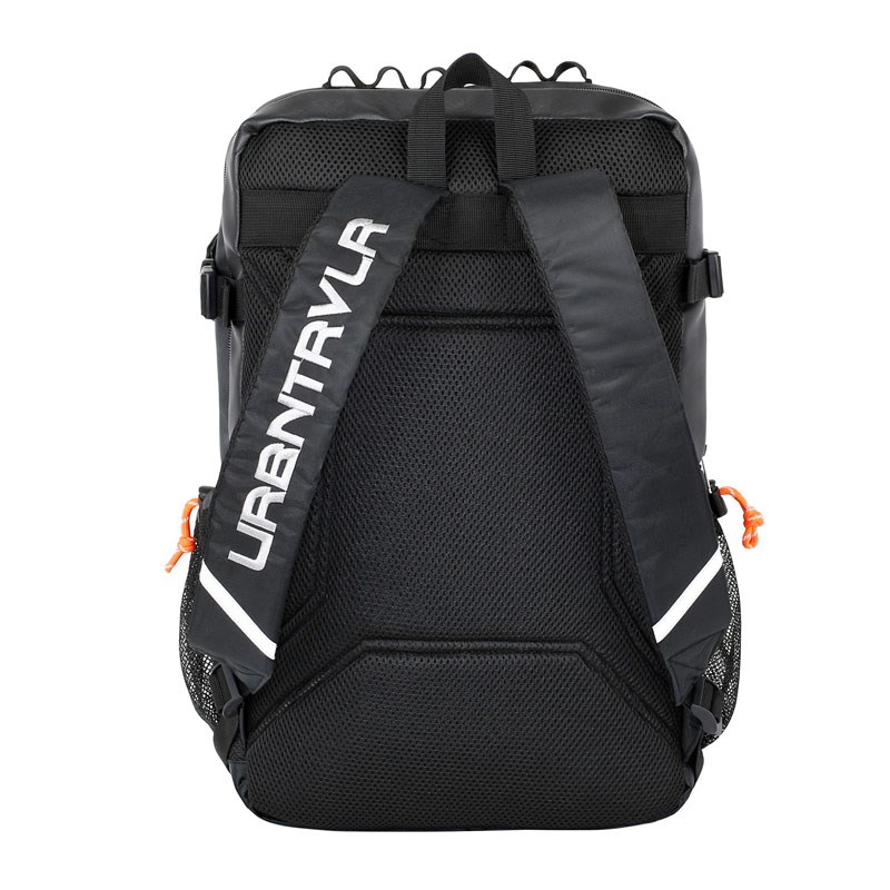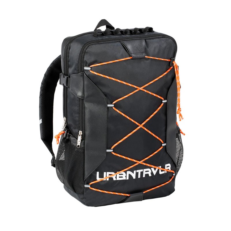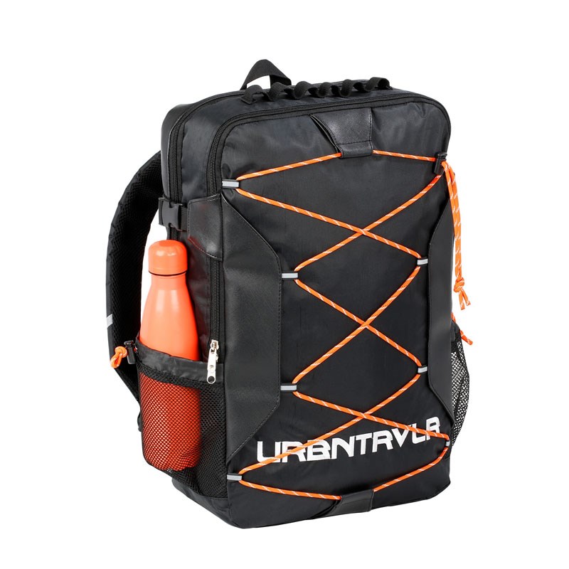 Ruksak s 2 pretinca pogodan za korištenje u srednjoj školi, studentima ili odraslima. Izrađen od poliesterskog materijala 420 denije i PU s efektom crne kože. Na prednjoj strani ruksaka nalazi se neonske narančaste gumice za umetanje sportskih dodataka poput reketa, skateboarda, strunjača za teretanu. Bočni džepovi od mrežastog materijala omogućuju vam da stavite bocu s vodom, malu bočicu vode ili mali kišobran. Leđa su podstavljena prozračnim i prozračnim mrežastim materijalom za veću udobnost. Naramenice su također podstavljene i podesive. Dva pretinca ruksaka zatvaraju se crnim plastičnim patentnim zatvaračima i plastičnim kopčama sa strane omogućuju podešavanje dubine ruksaka. Donja strana izrađena je od neklizajućeg i vodootpornog crnog PVC materijala kako biste slobodno položili ruksak na tlo. Narančasta podstava. U 2. pretincu nalazi se pjenasti pretinac za 15″ računalo. Više malih unutarnjih džepova omogućuje vam jednostavno razvrstavanje.