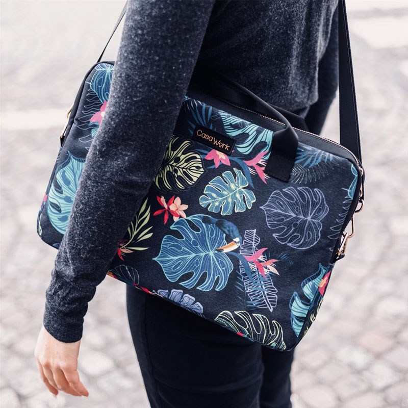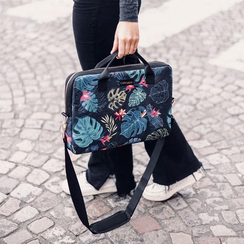 Torba za laptop kompatibilna za računala do 15,6″, idealno 15″. Navlaka izvana od poliestera od 600 dena s Tropical uzorkom, a s unutarnje strane od mekanog crvenog neoprena kako ne bi oštetio laptop. Kompaktna pjena koja dobro štiti računalo. Ručka i remeni za jednostavnije nošenje.