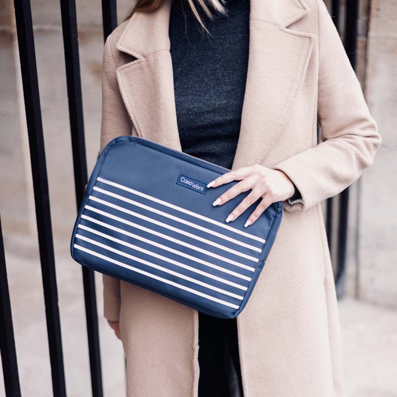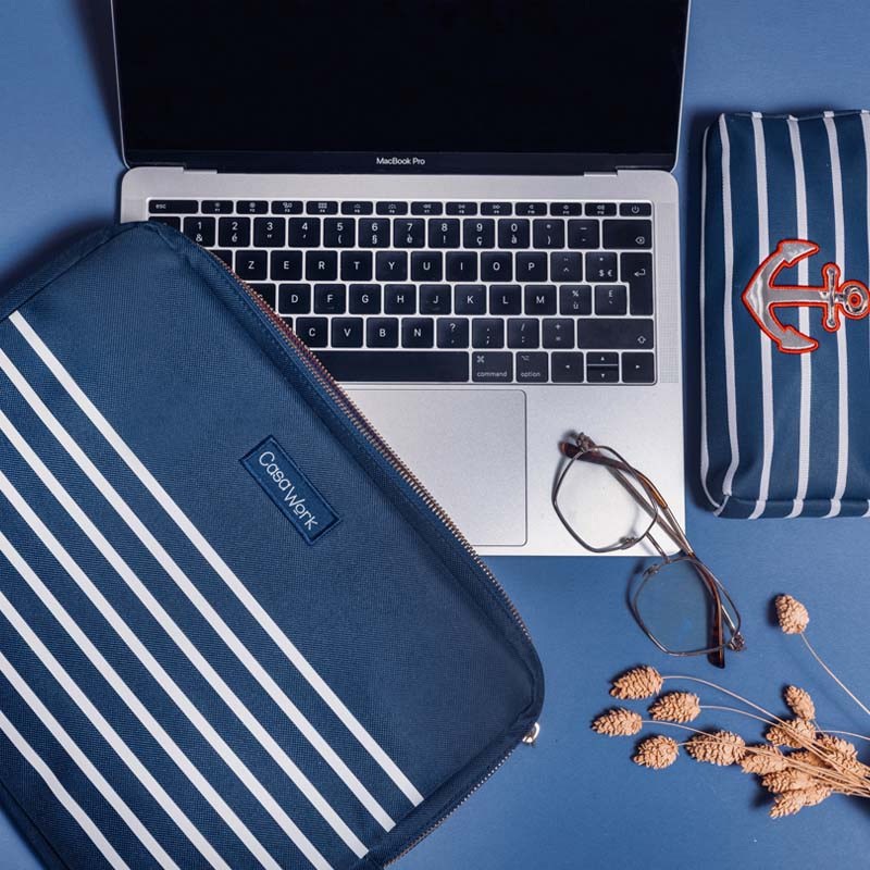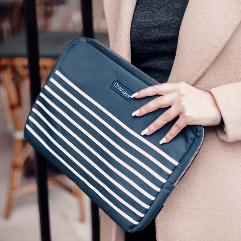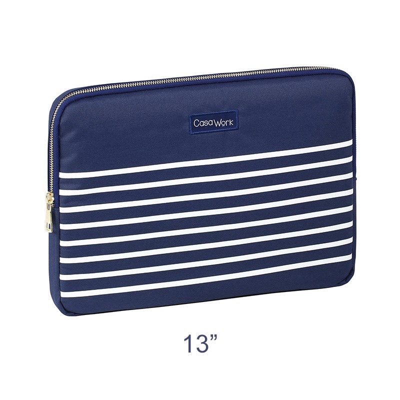 Torba za laptop kompatibilna za računala do 13″. Navlaka izvana od poliestera od 600 dena s plavo-bijelim uzorkom, a s unutarnje strane od mekanog crvenog neoprena kako ne bi oštetio laptop. Zatvaranje cifom, bez ručki.