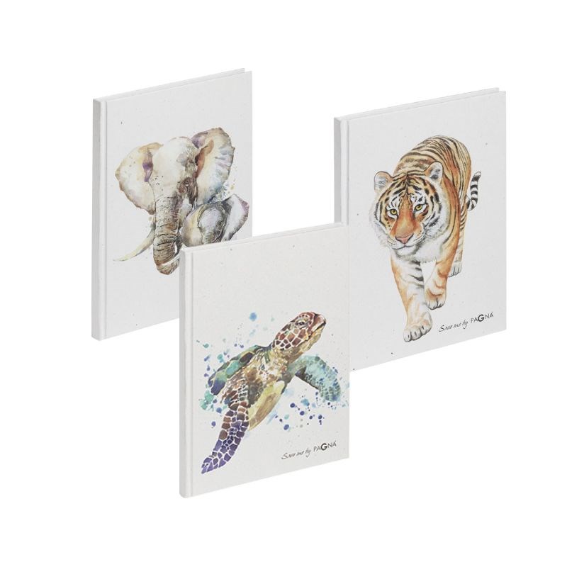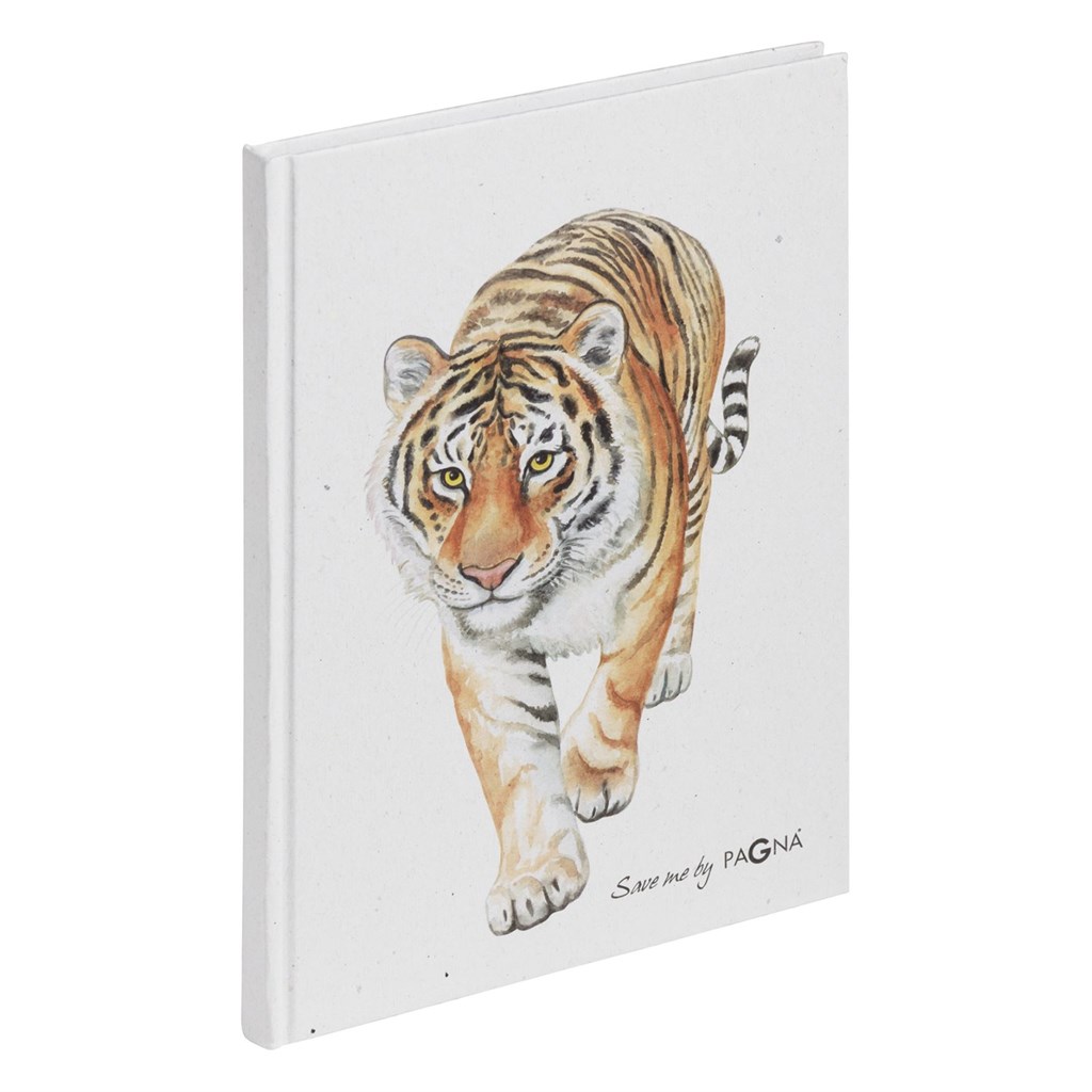 Bilježnica iz kolekcije Save me No.3 s 128 stranica nudi dovoljno prostora ua brze bilješke i opširna razmišljanja. Praktični A5 format. Dopadljivi motivi tigra, kornjače i slona u stilu akvarela. Svijetli reciklirani materijal naglašava karakter crteža i pokazuje odnos između prirodnih motiva i ekološki prihvatljivih materijala.