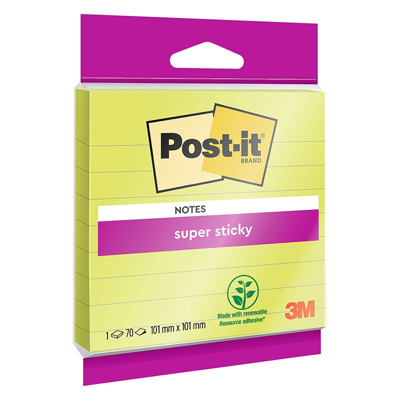 Post-it® Super Sticky samoljepivi blokovi s crtama većeg formata što ih čini idealnim za pisanje više bilješki ili ostavljanje dugih poruka i podsjetnika. Super Sticky ima 2x veću moć lijepljenja od Post-it® originalnih bilješki tako da su savršene za okomite i teško lijepljive površine.