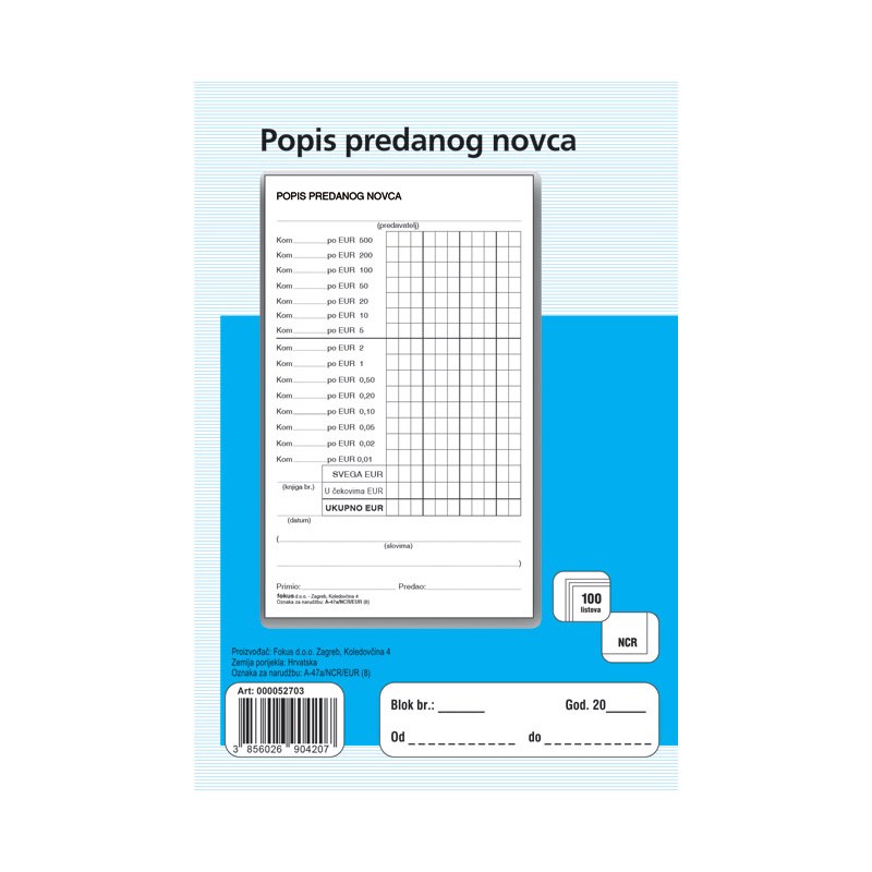 | F-A-47A/NCR | Popis predanog novca, blok 100 listova, EUR / KOM |