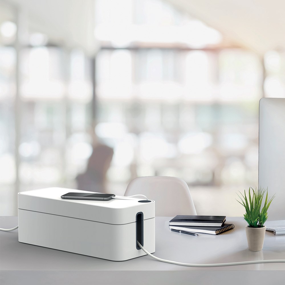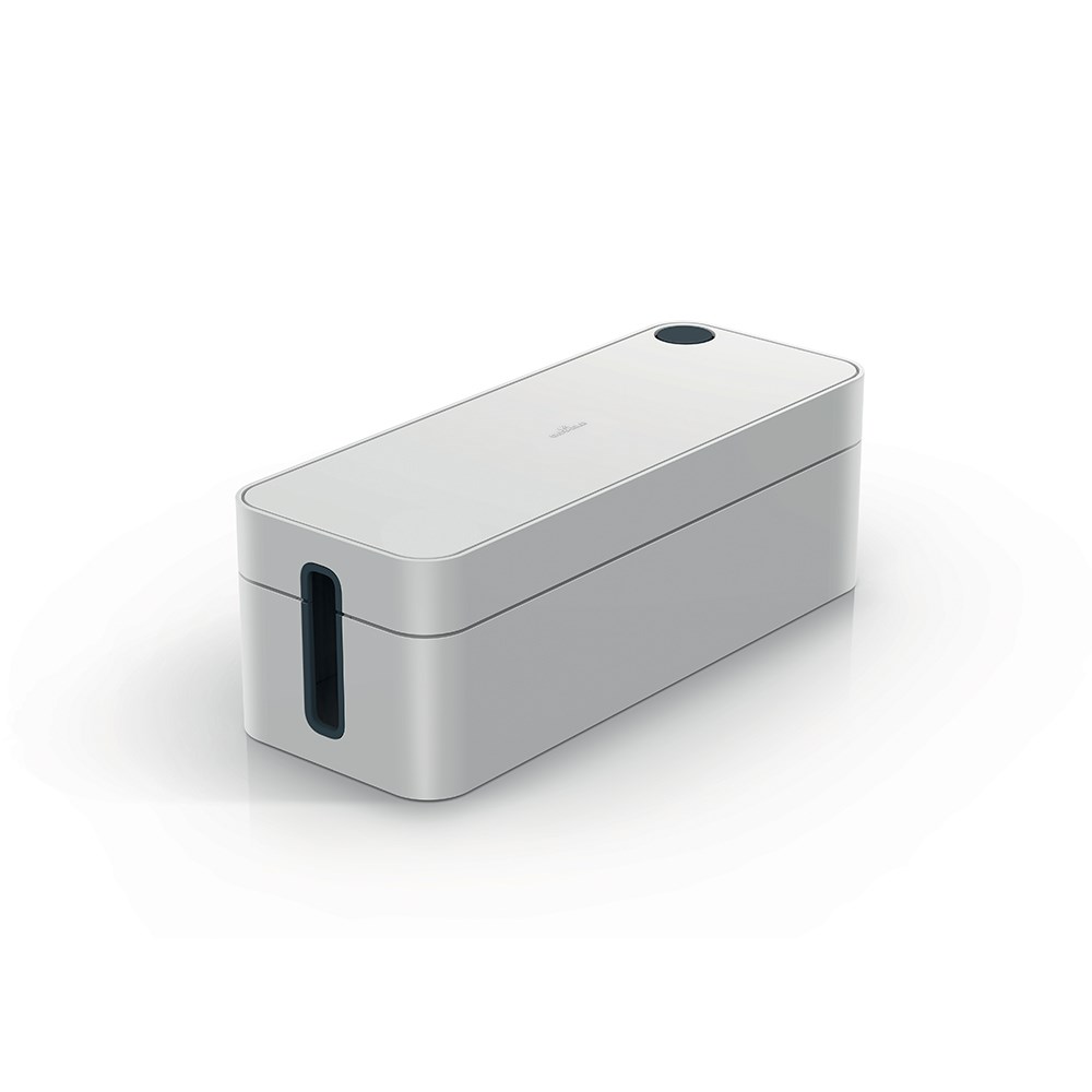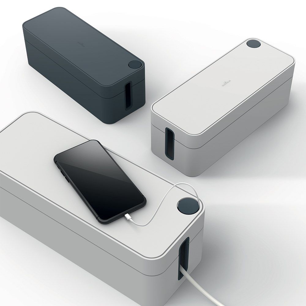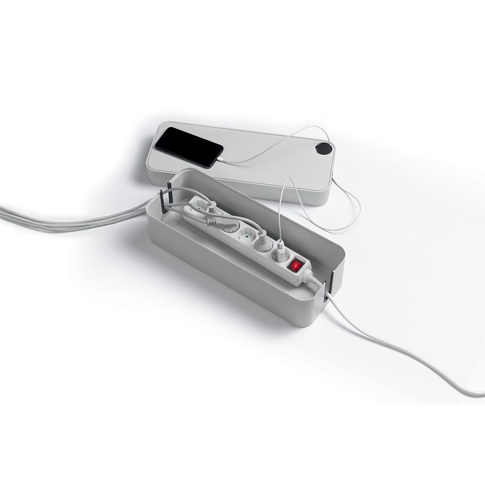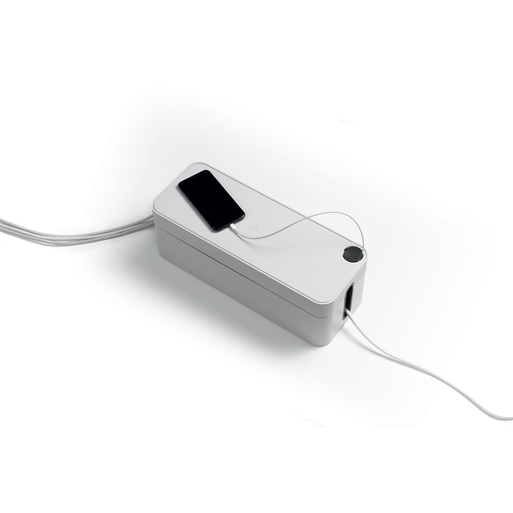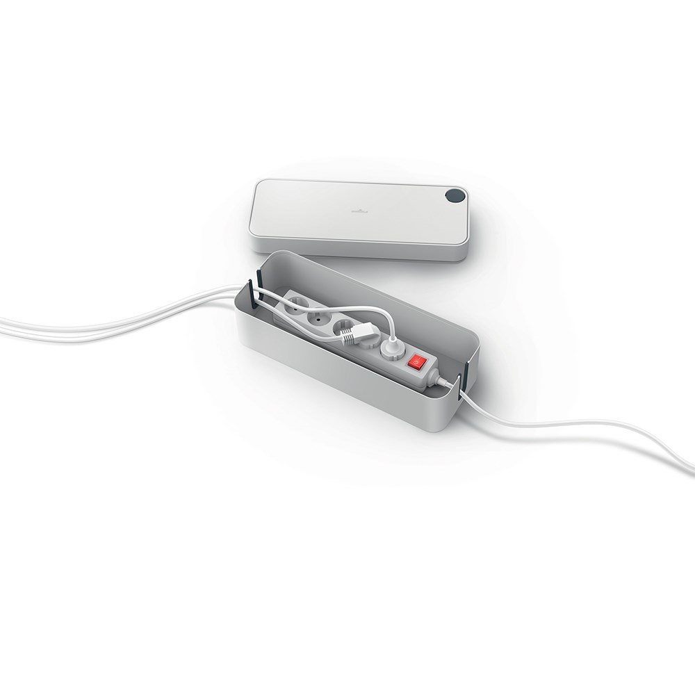 Elegantna kutija za držanje kabela i produžnih setova do 5 utičnica. Dvostrani gumirani bočni otvori za jednostavno rukovanje i dobru cirkulacija zraka, poklopac s praktičnim kružnim otvorom za kabel za punjenje mobilnog telefona, velike gumirane podloge za stabilnost bez klizanja. Izrađeno od visokokvalitetne plastika otporna na vatru.