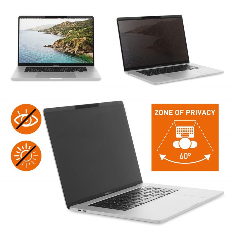 Filter za monitor za zaštitu povjerljivih podataka prilikom rada u kutu od 60°. Jednostavno pričvršćivanje i micanje filtera pomoću dva neodimijska magneta. Mat površina sprječava naprezanje očiju, a sam filter smanjuje štetno plavo svjetlo. Može se koristiti i na zaslonima na dodir. Štiti od prašine i ogrebotina.