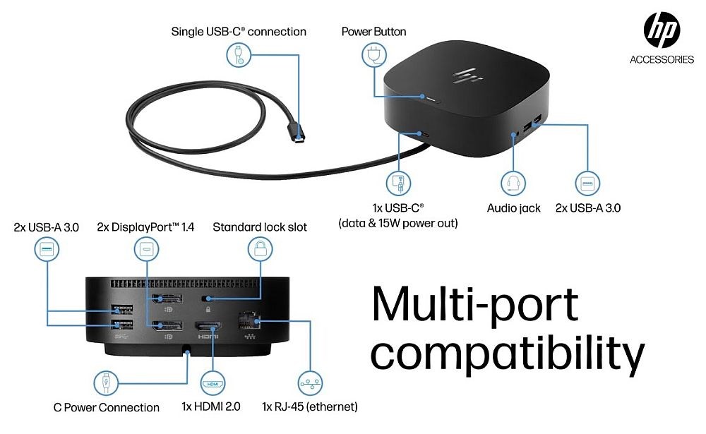 | 5TW10AA | 1×USB-C, 2×USB-A, 2×DP 1.4, 1×HDMI 2.0, 1×LAN, crn / KOM |