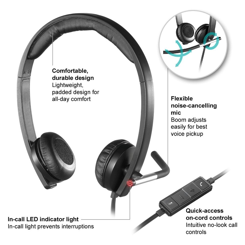 Slušalice Logitech H650e pružaju funkcionalnost i stil. Ovo su profesionalne slušalice s digitalnom obradom signala, akustičnim otkazivanjem odjeka, širokopojasnim zvukom, dinamičkim ekvilajzerom i mikrofonom za uklanjanje buke. To čini vaše pozive produktivnijim i ugodnijim.