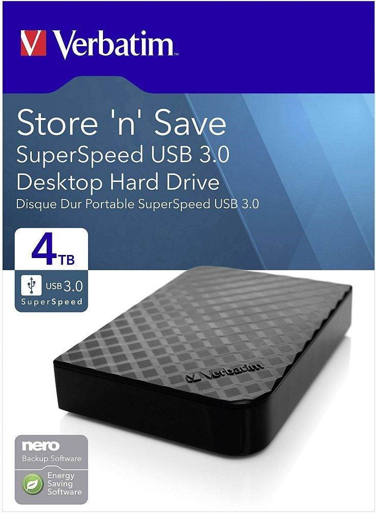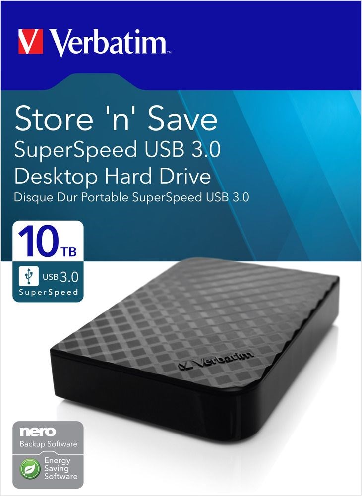 Verbatimov USB 3.0 stolni tvrdi disk ima visoke performanse pomoću USB 3.0 "Super Speed" sučelja koji nudi do 10 bržu brzinu prijenosa od USB 2.0. On je retrogradno kompatibilan sa svakim USB 2.0 ulazom na vašem prijenosnom ili stolnom računalu. Store 'n' Save GEN2 se može držati ravno ili na boku, što osigurava više slobodne površine na vašem radnom stolu. Disk posjeduje vanjsko napajanje. Softver se dostavlja uz disk; Nero Backup radi sigurnosnu kopiju svih vaših datoteka, raspored, komprimiranje i šifriranje sigurnosne kopije (softver nije kompatibilan s Mac OS). Green Button se koristi za uštedu energije.