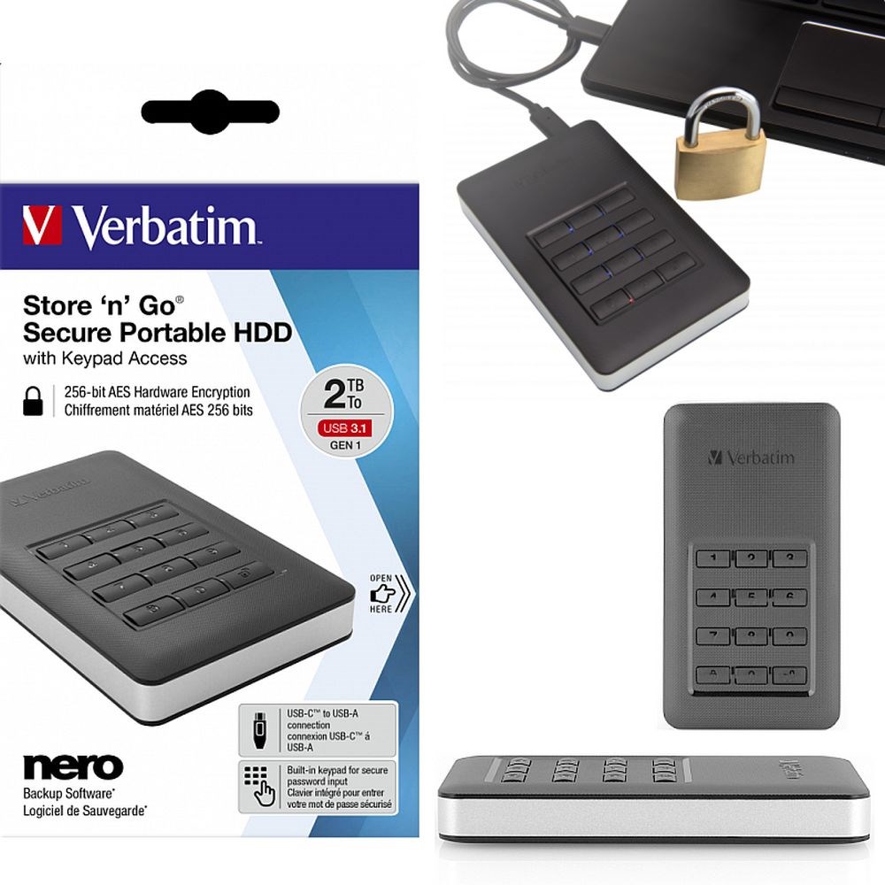 Verbatimov Store n Go USB 3.1 sigurni prijenosni HDD s tipkovnicom za pristup. On je retrogradno kompatibilan sa svakim USB 3.0 i 2.0 ulazom na vašem prijenosnom ili stolnom računalu. Za rad pogona nije potrebno vanjsko napajanje.