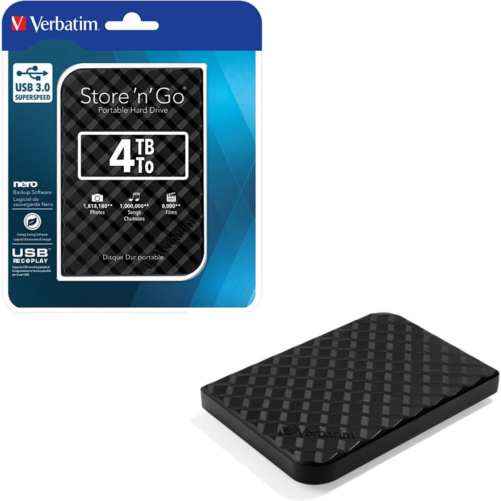 Verbatimov Store n Go prijenosni tvrdi disk je savršen za prijenos podataka. Ima visoke performanse pomoću USB 3.0 "Super Speed" sučelja koji nudi do 10 bržu brzinu prijenosa od USB 2.0. On je retrogradno kompatibilan sa svakim USB 2.0 ulazom na vašem prijenosnom ili stolnom računalu. Za rad pogona nije potrebno vanjsko napajanje. Softver se dostavlja uz disk; Nero BackItUp radi sigurnosnu kopiju svih vaših datoteka, (softver nije kompatibilan s Mac OS) Postoje 3 opcije "Postavki pasivnog rada"; isključivanje nakon 10 minuta uporabe ili u razmacima od 10 do 120 minuta.