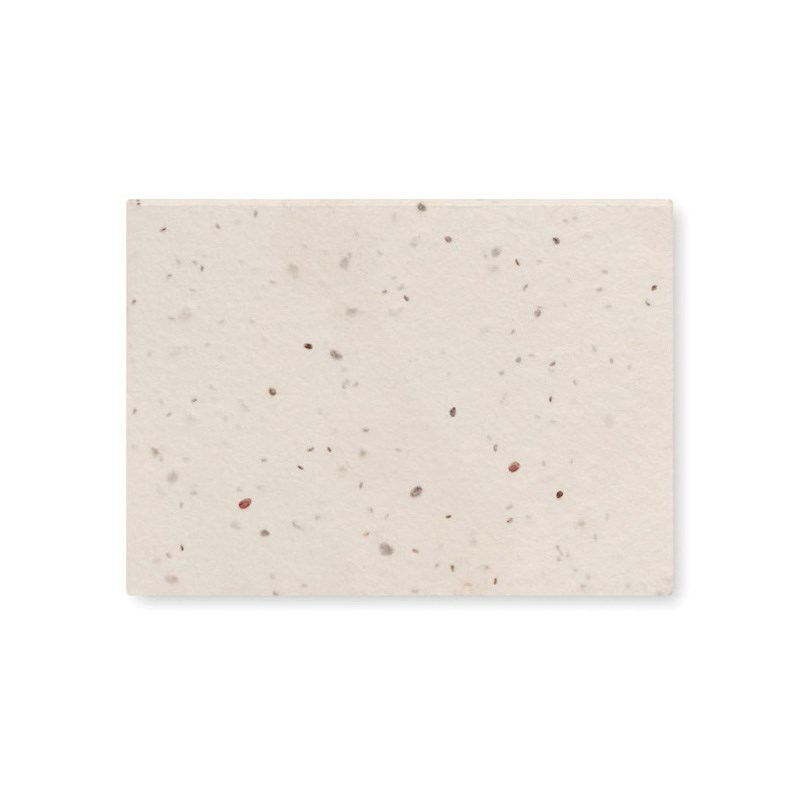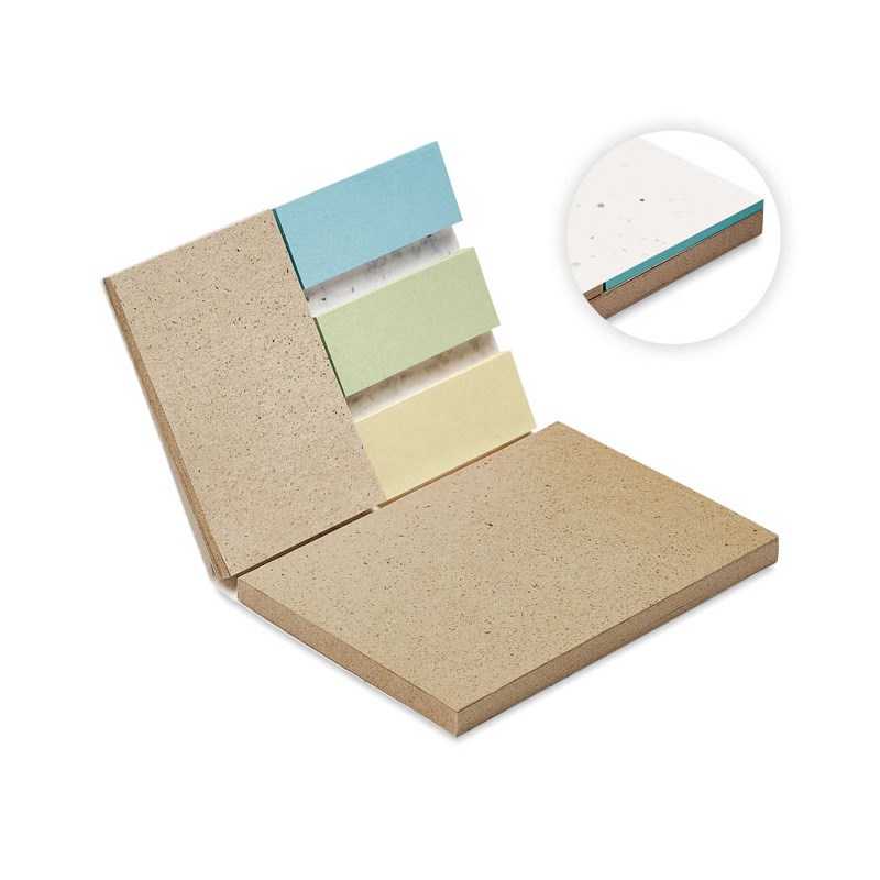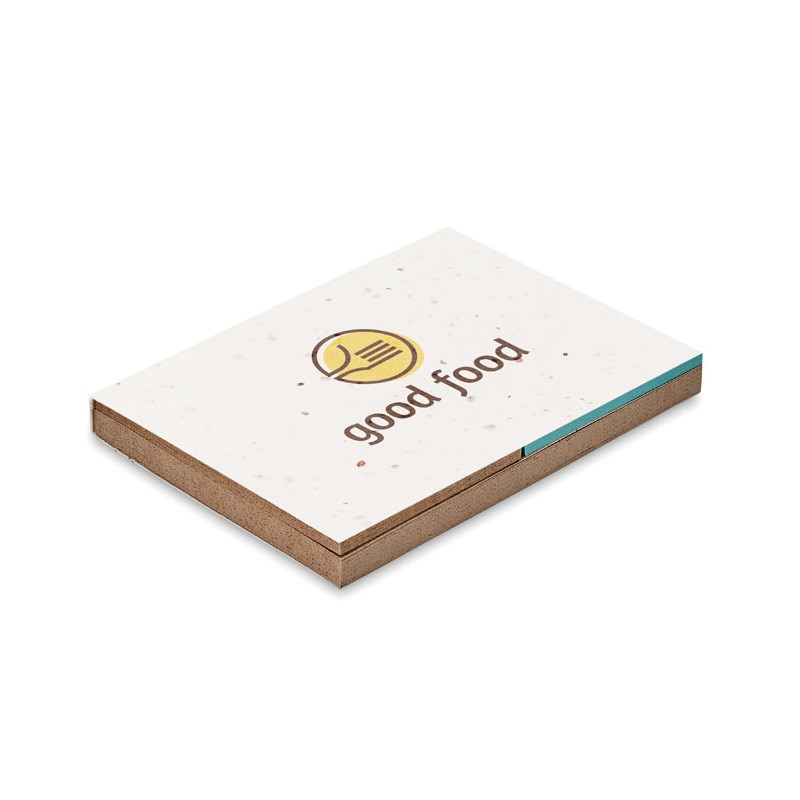 Set za bilješke s mekim koricama i koricama od papira za uzgoj, 25 listova ljepljivog papira s travom i 3 seta samoljepivih listića. Kada iskoristite sve listiće blok možete posaditi u tlo.
