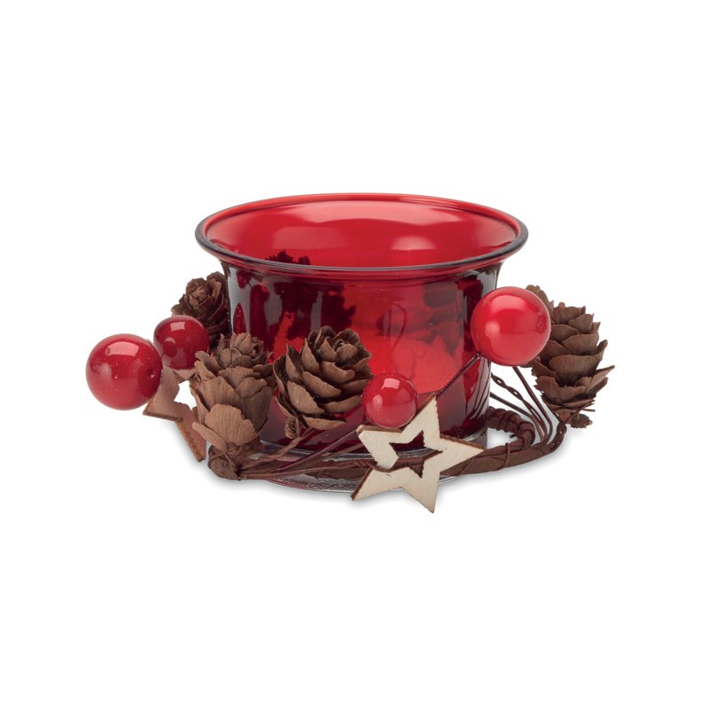 Stakleni svijećnjak okružen ukrasima. Spakiran u PVC kutiji s trakom.