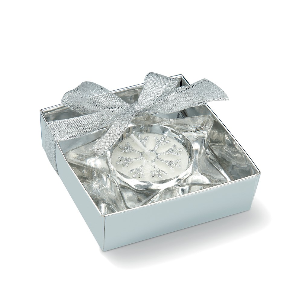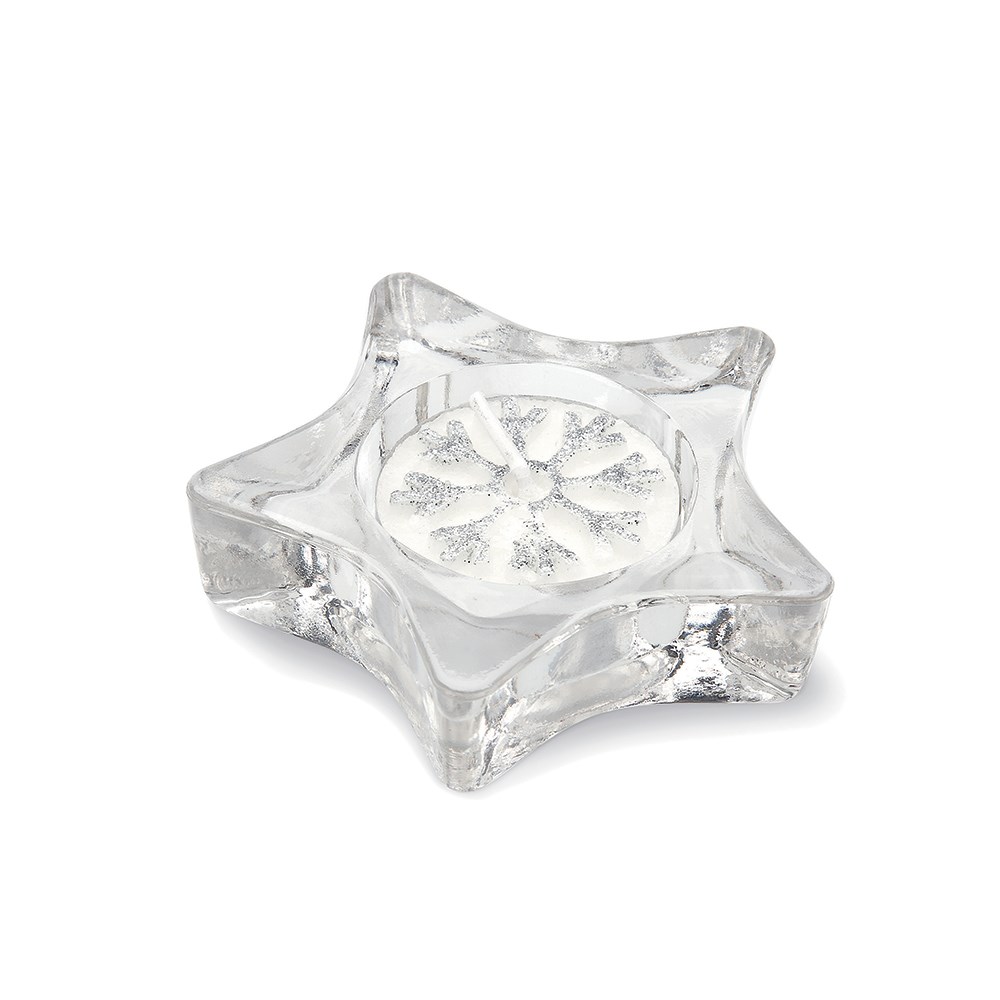 Stakleni svjećnjak u obliku zvijezde, za lučice (1 uključena), u poklon kutiji.