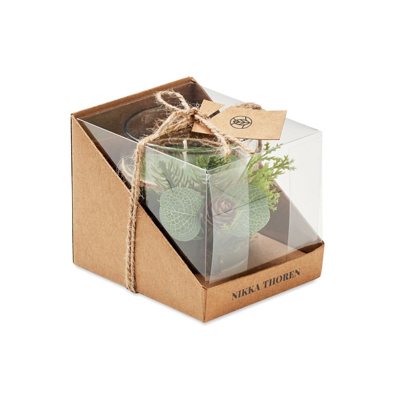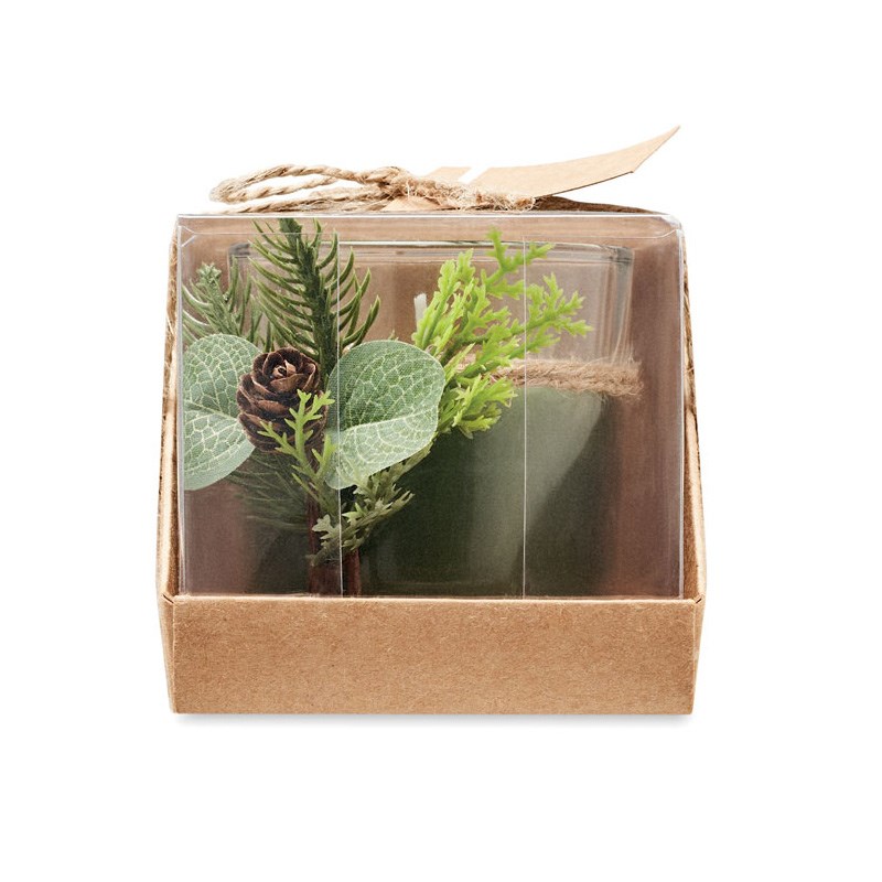 Stakleni svijećnjak (120 gr) sa šumskim aranžmanom. Isporučuje se u kartonskoj i PVC kutiji s užetom od jute i kraft etiketom.