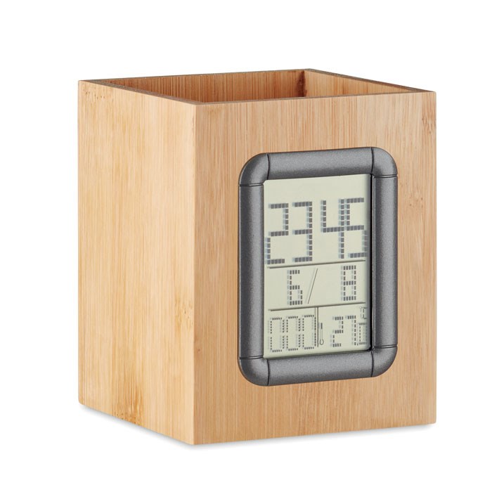 Čaša za olovke od bambusa s digitalnim kalendarom, budilicom i termometrom. Prirodni materijal čaše za olovke sjajno će izgledati na svakom uredskom ili kućnom stolu. Održavajte svoj radni prostor čistim i pohranite sve svoje olovke, olovke i ostali uredski pribor. Prikazane informacije informirat će vas o trenutnom vremenu, datumu i sobnoj temperaturi. Uključene su 2 ćelijske baterije.