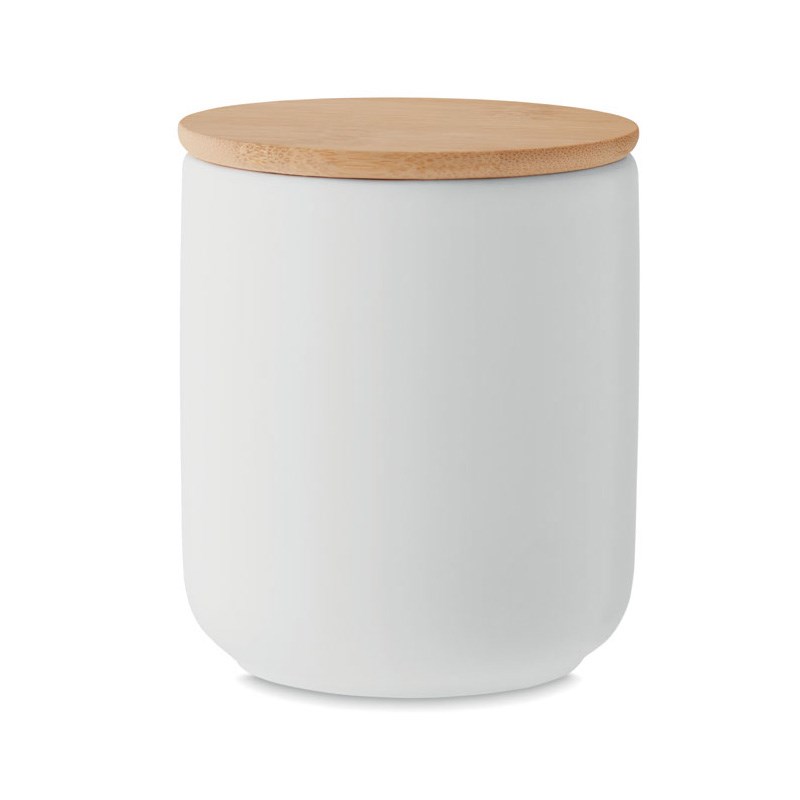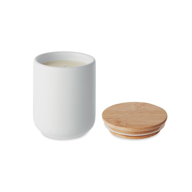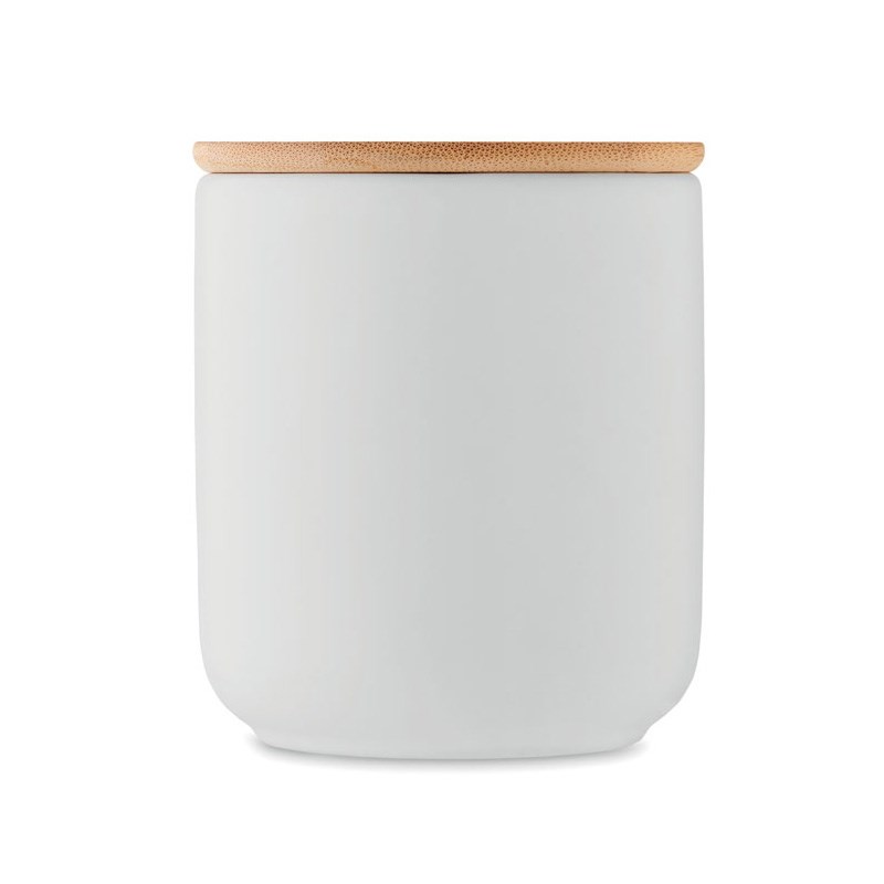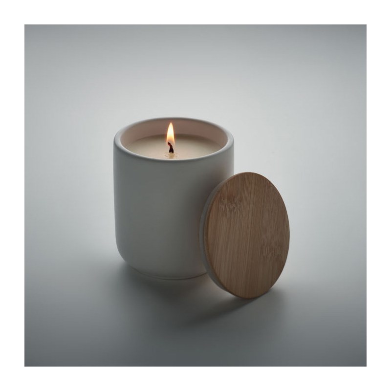Voštana svijeća s biljnim mirisom svježeg lana u držaču staklenke od kamenine s poklopcem od bambusa. 200 gr. Vrijeme gorenja: 36 sati.