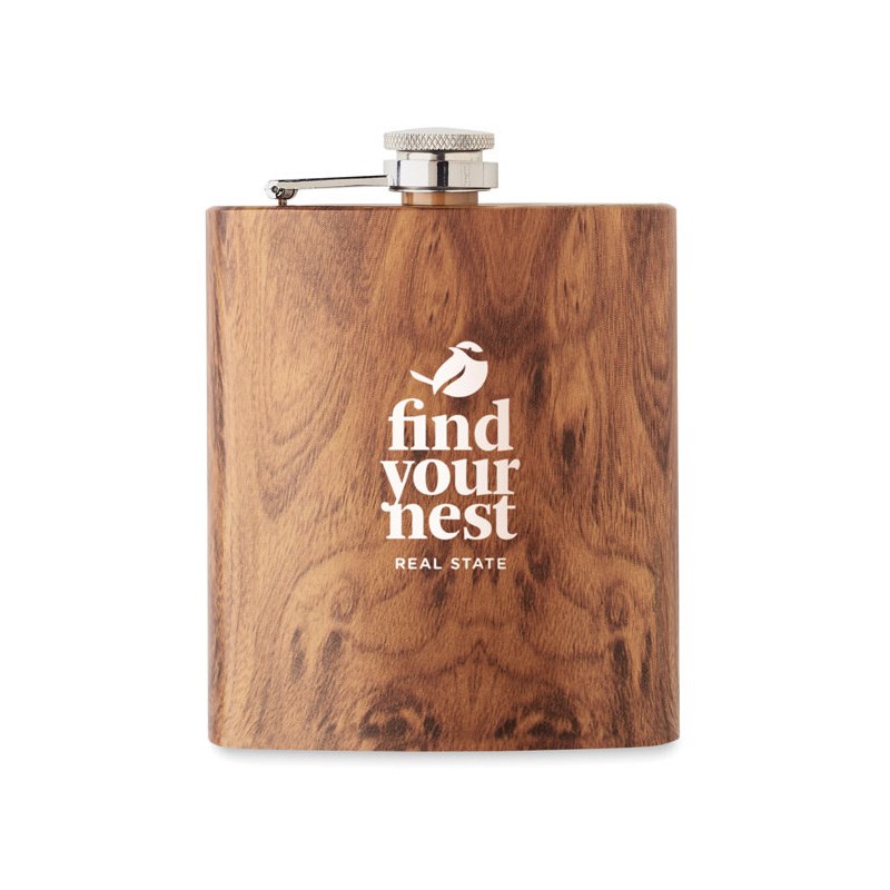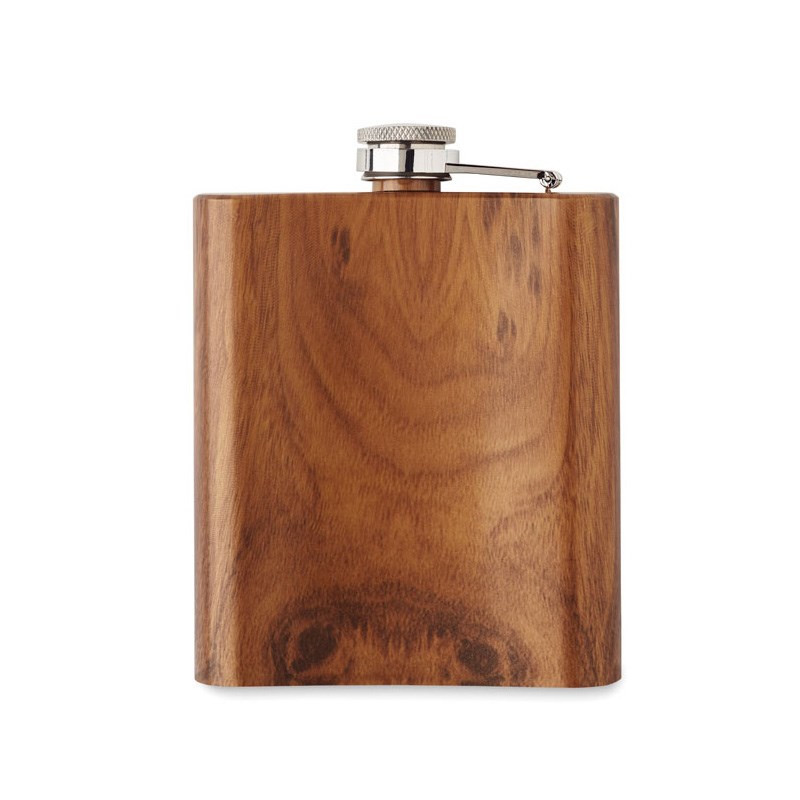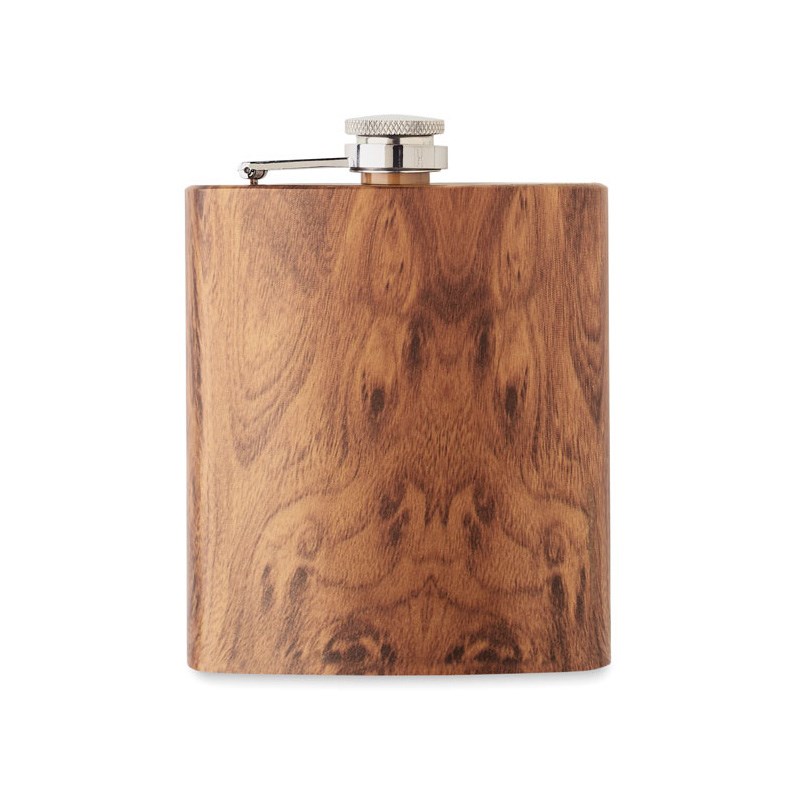 Tanka pljoska od recikliranog nehrđajućeg čelika (90% recikliranog nehrđajućeg čelika i 10% nehrđajućeg čelika) s drvenim izgledom. Kapacitet 190 ml.