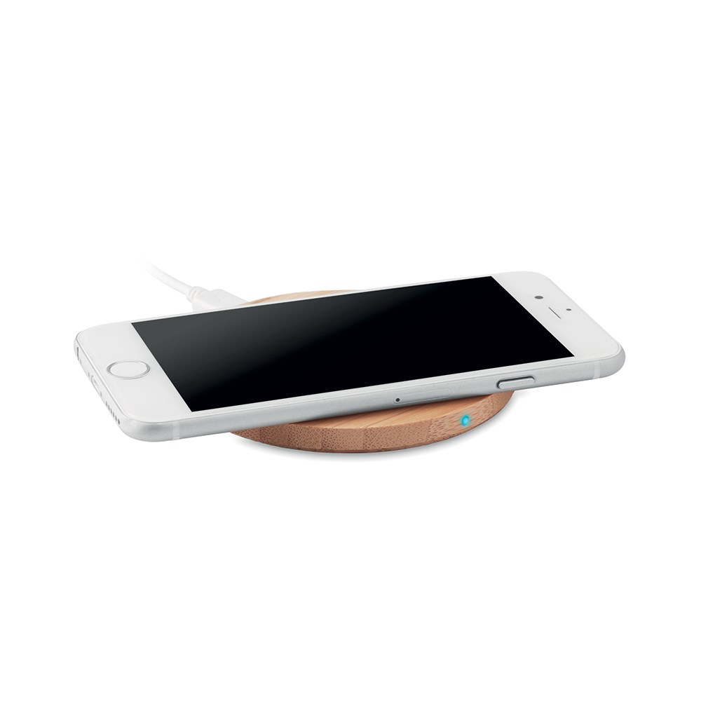 Bežični punjač od bambusa. Povežite uređaj s računalom, postavite ga na pametni telefon i dopustite da se napuni. Plavo svjetlo svijetli prilikom punjenja. Izlaz: DC5V / 1,0A. Kompatibilan sa svim QI: Android, iPhone® 8, 8S i X i noviji.