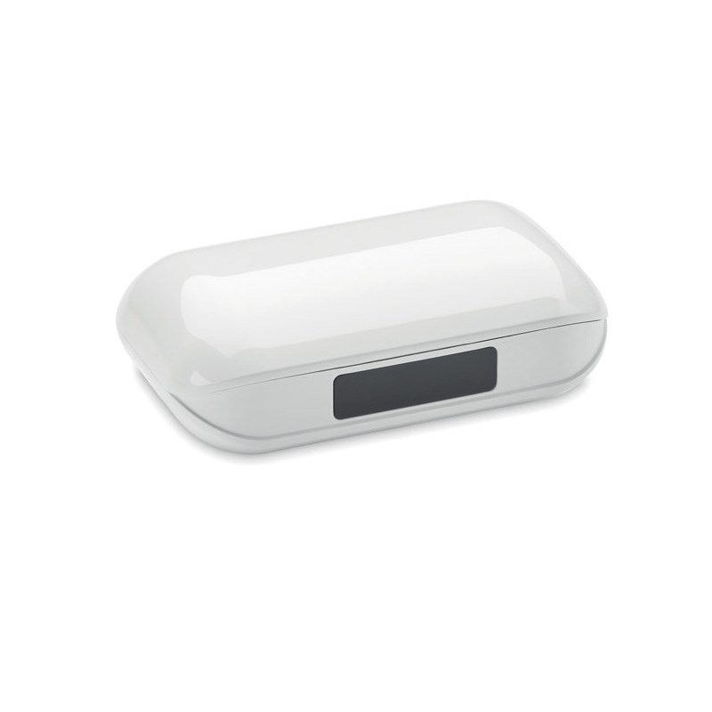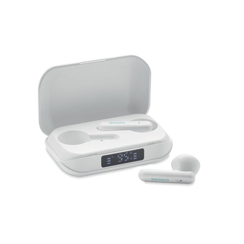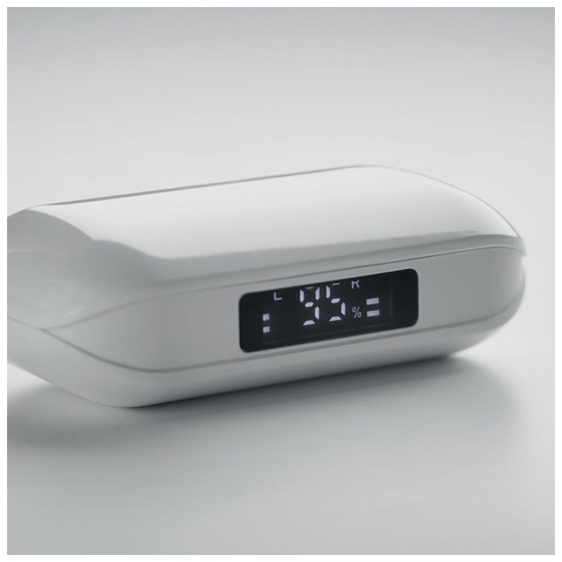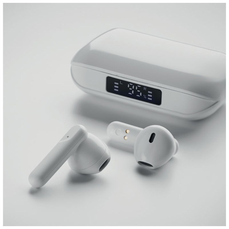 Bežične stereo slušalice od recikliranog ABS-a. True Wireless Stereo (TWS) 5.3 s mikrofonom i baterijom od 25 mAh. Vrijeme sviranja cca. 3 sata. Ima LCD zaslon razine napunjenosti. Automatsko uparivanje. Uključujući tip C kabel za punjenje i stanicu za punjenje od 250 mAh.