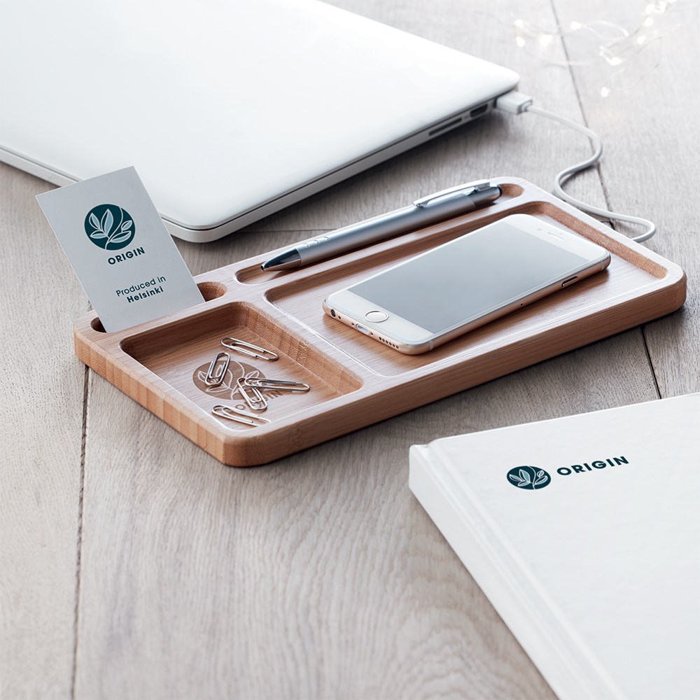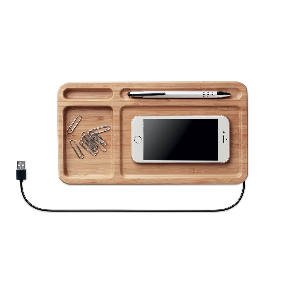 Stolni stalak za pribor s bežičnim punjačem mobitela. Izrađen od bambusa. USB kabel 80 cm. Izlazni DC 5V / 1A. Kompatibilan sa svim QI omogućenim uređajima kao što su najnoviji androidi, iPhone® 8, 8S i X i noviji.