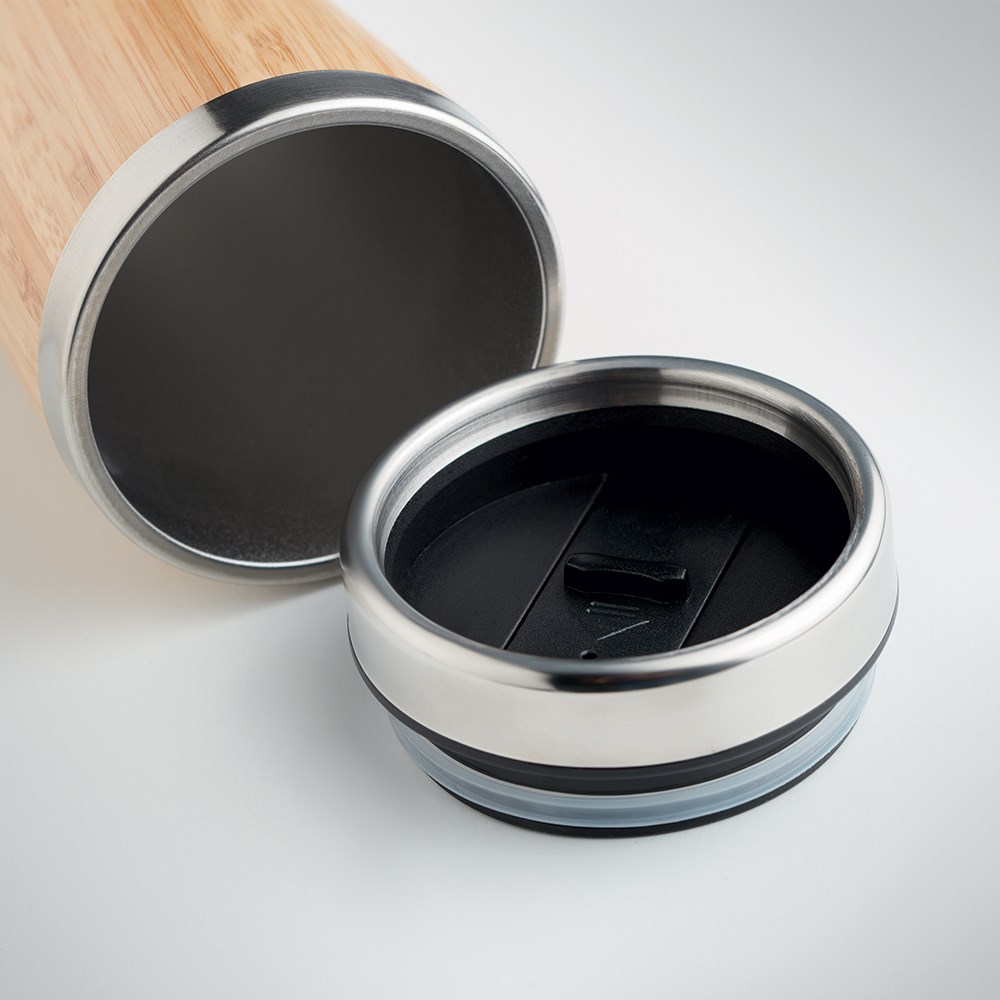 Termos šalica s dvostrukom stjenkom od nehrđajućeg čelika i oblogom od bambusa, PP poklopac. Kapacitet 400 ml.
