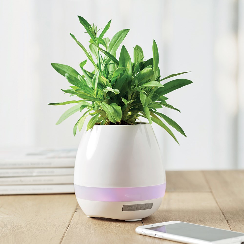 Magic vaza sa svjetlom i bluetooth zvučnikom. Izlaz zvučnika 5W. Glazba se može uključiti normalno ili dodirivanjem biljke. Uključena punjiva litijska 1500 mAh baterija. Dimenzije: 11x11 cm.