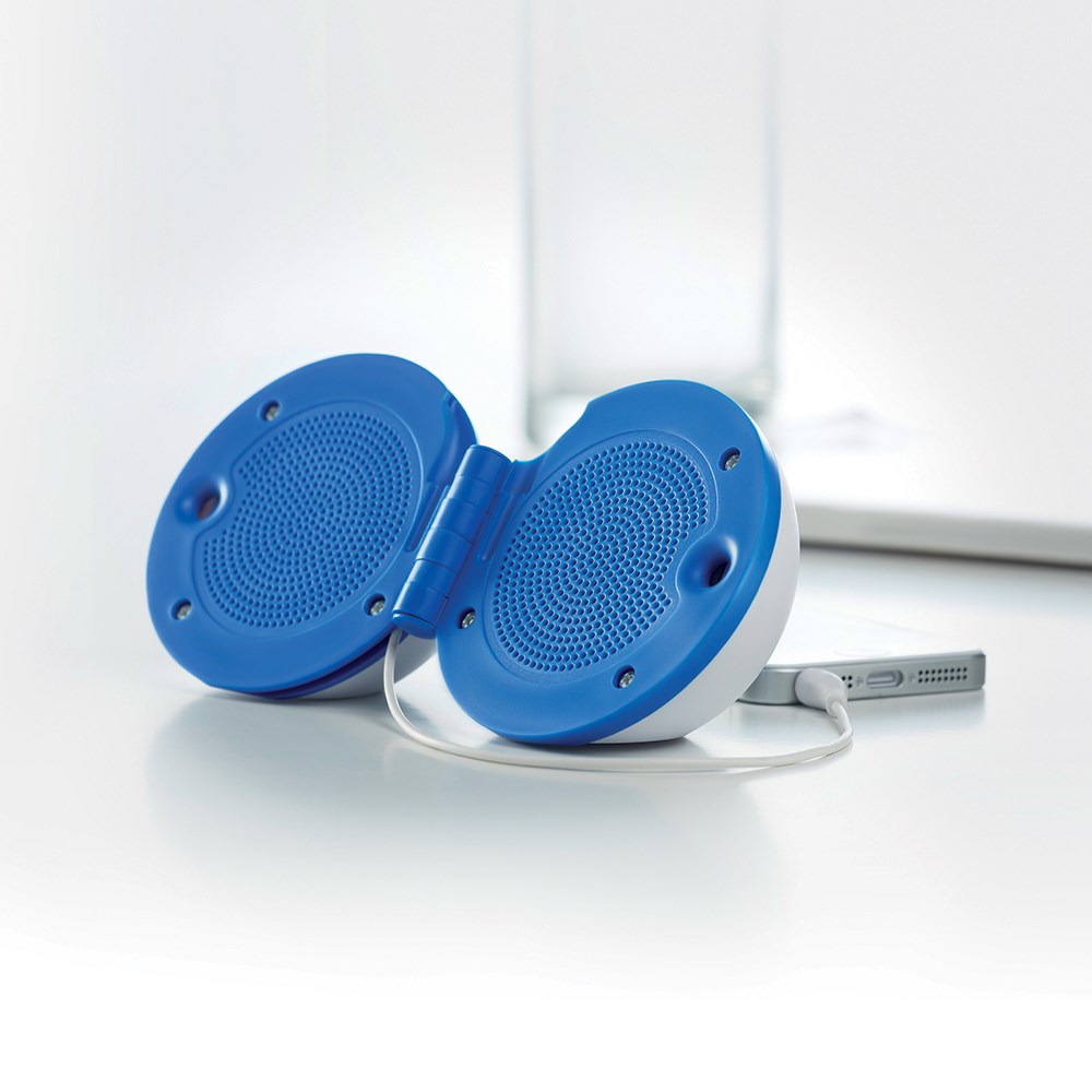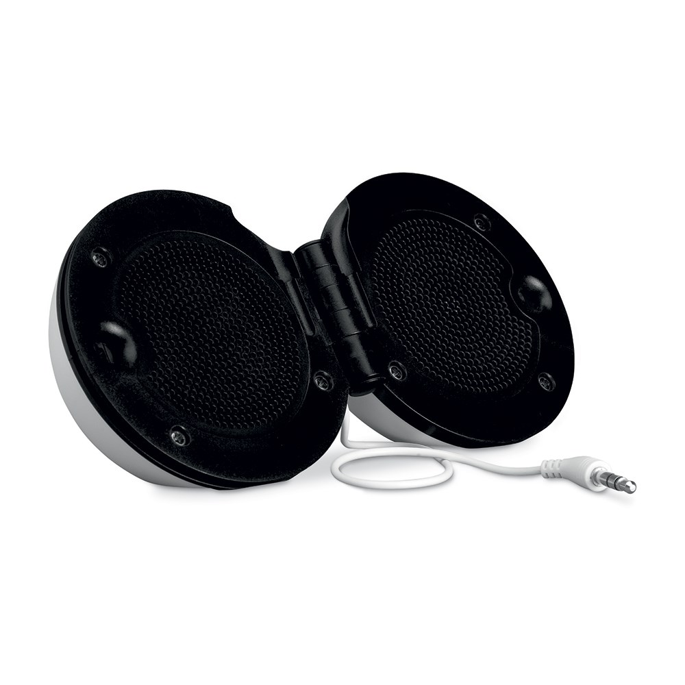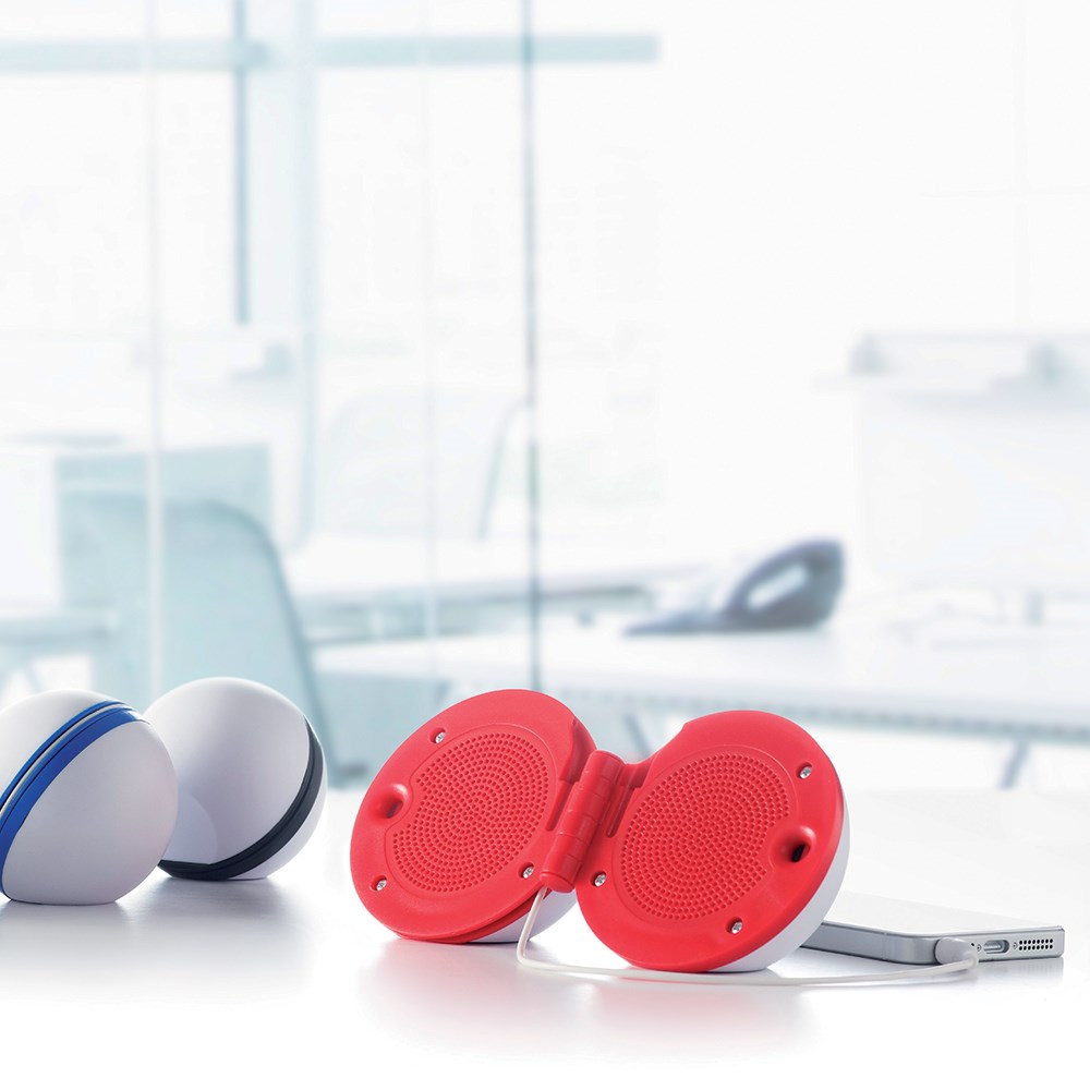 Sklopivi stereo zvučnik u obliku lopte. Utični kabel za pametne telefone ili tablete. Izlazna snaga 2W. Dimenzije: Ø7,5 cm.