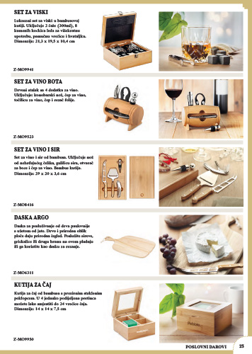 Set za vino i sir od bambusa. Uključuje nož od nehrđajućeg čelika, gulilicu sira, otvarač za boce i čep za vino. Bambus kutija.