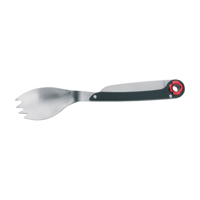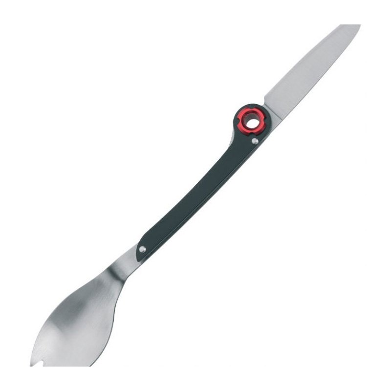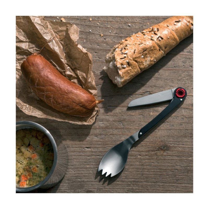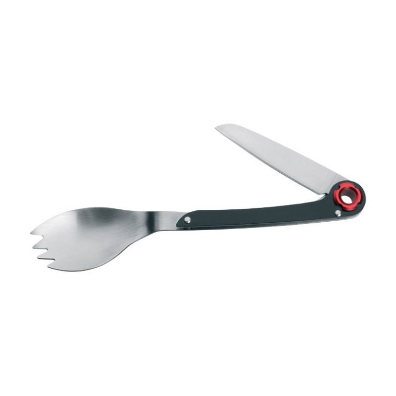 Višenamjenska žlica koja uključuje nož, a vrh žlice može se koristiti kao vilica. Idealno rješenje kao pribor za jelo za vaše kampiranje. Dimenzije: sklopljen 15 cm, rasklopljen 21 cm, oštrica noža 6 cm. Zapakirano u vrećici i poklon kutiji.