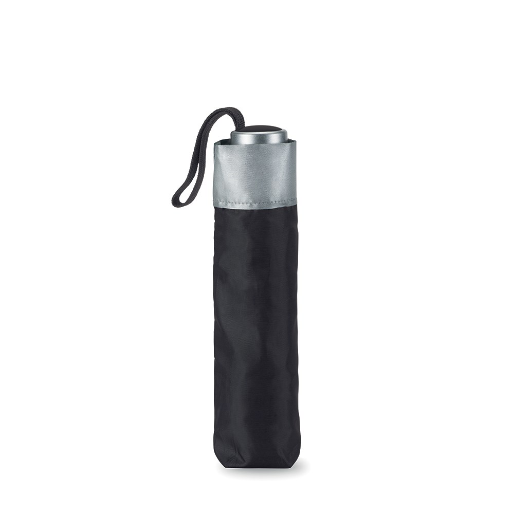 Sklopivi 3-djelni kišobran 21“ s ručnim otvaranjem/zatvaranjem. Unutra i rub srebrni, plastična ručka s obodom u boji i crnim zglobnim remenom.