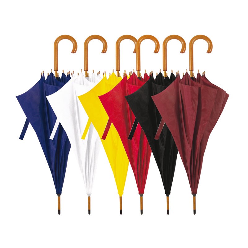 Kišobran automatik s drvenom drškom. Polumjer zatvorenog kišobrana: 63 cm; fi: 103 cm. Materijal: poliester.