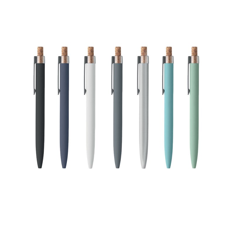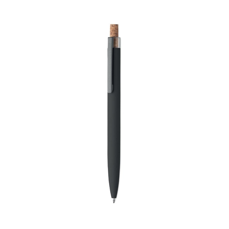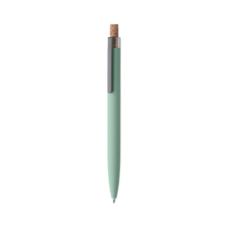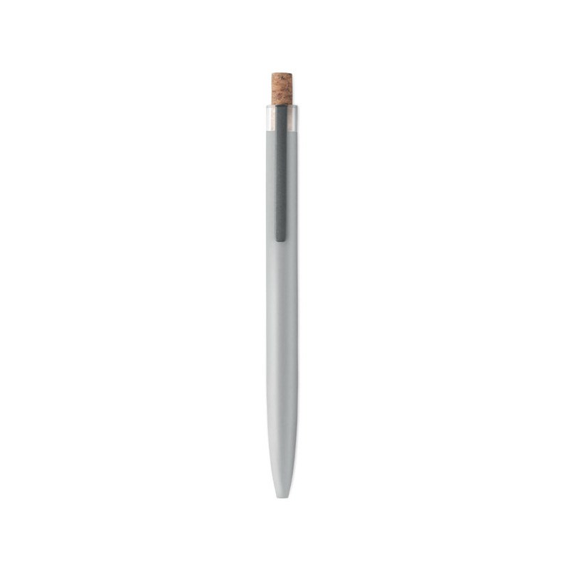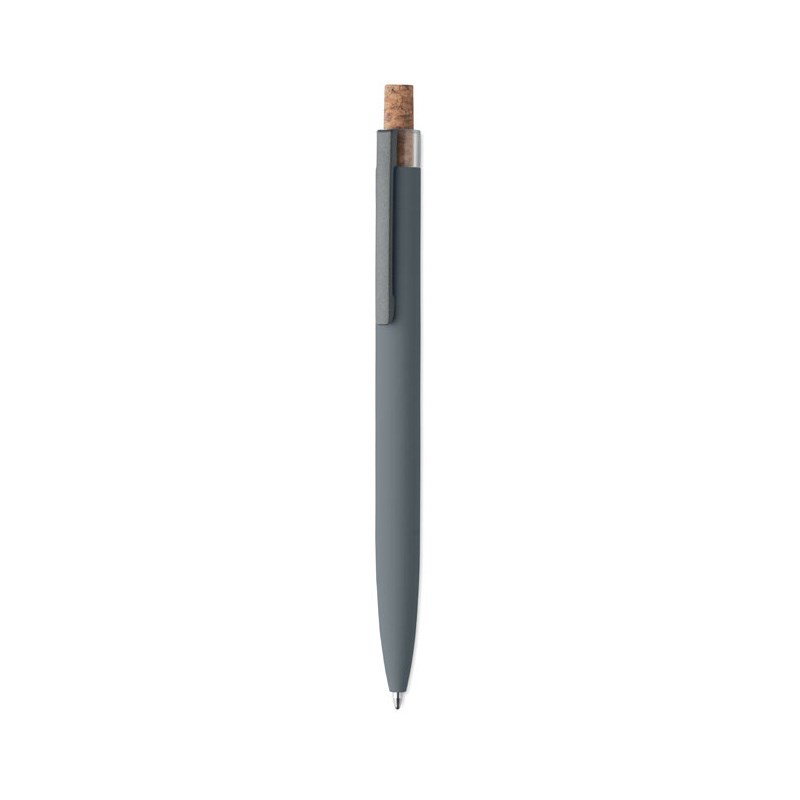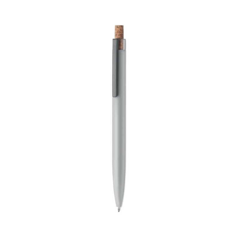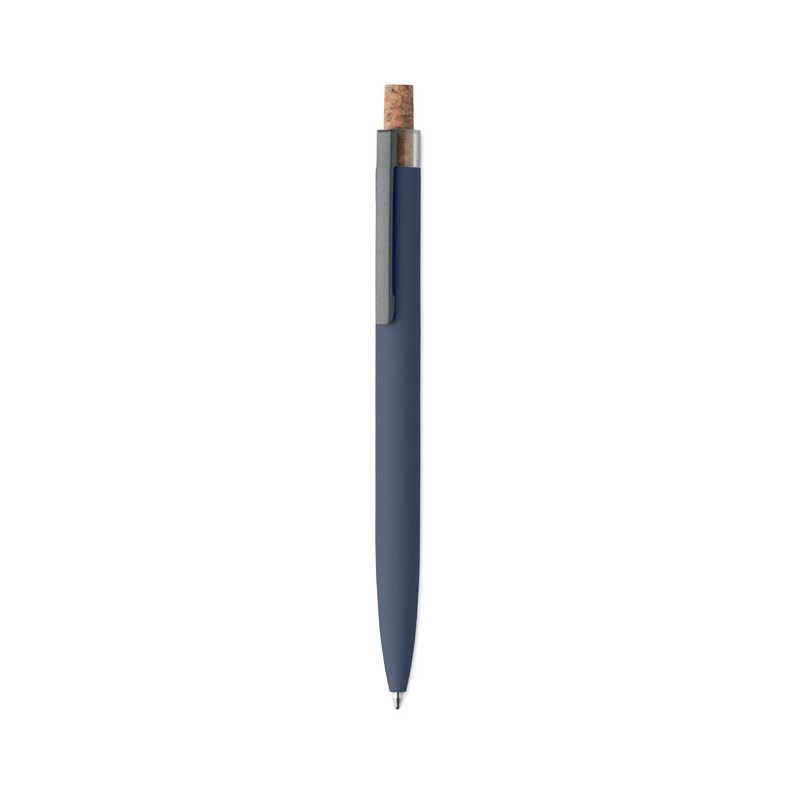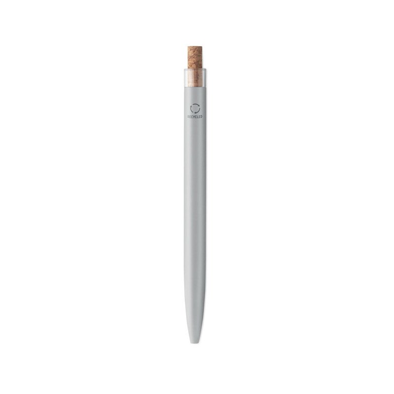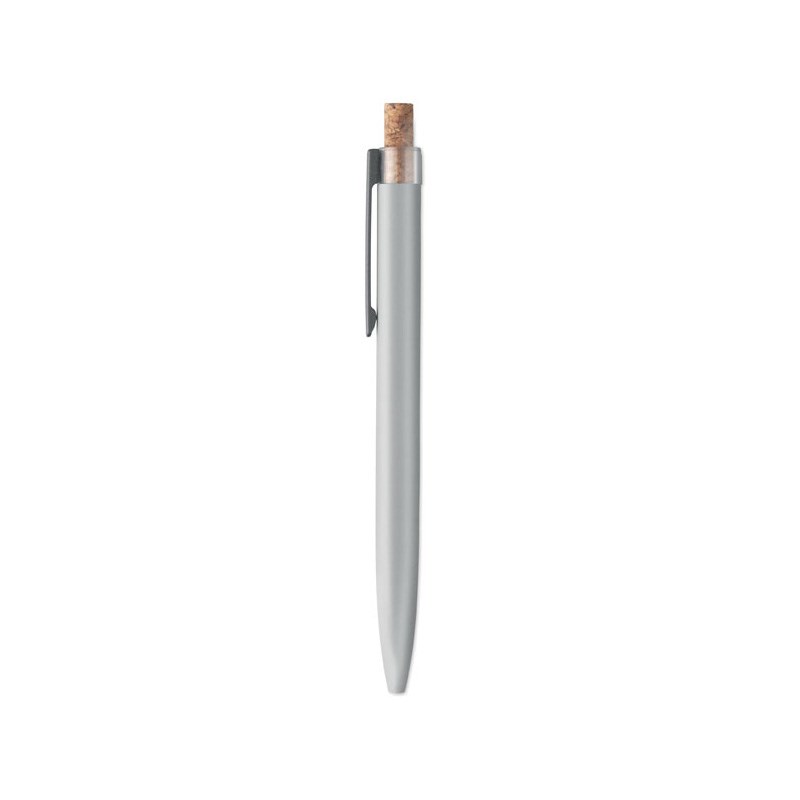 Kemijska olovka od recikliranog aluminija s plutenim detaljnim gumbom i metalnom kopčom. Plava tinta.