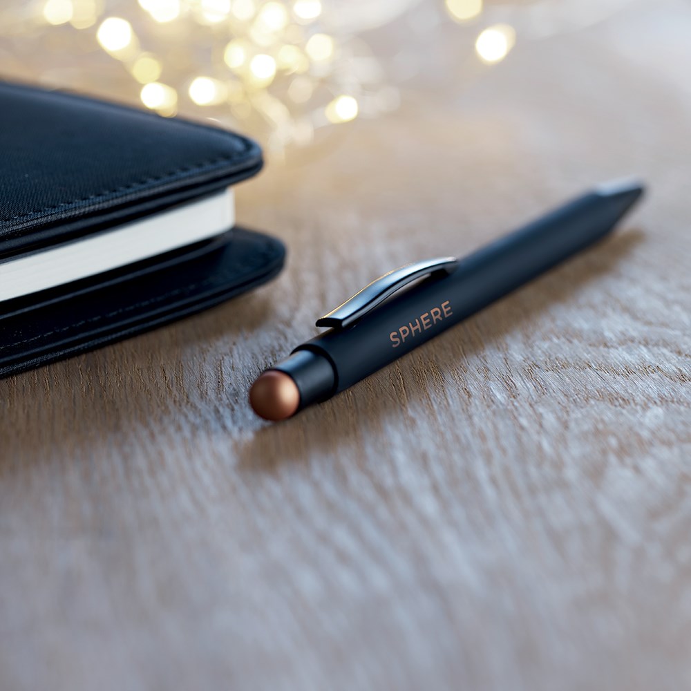 Kemijska olovka od aluminija. Kada je logotip ugraviran na tijelo olovke, boja logotipa odgovara boji na vrhu. Plava tinta.