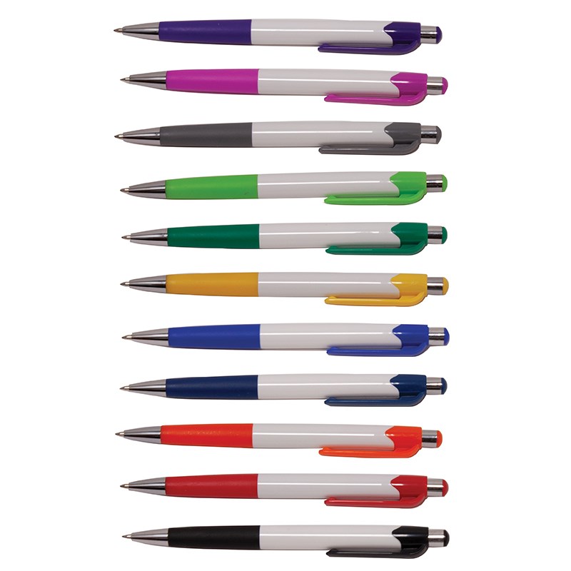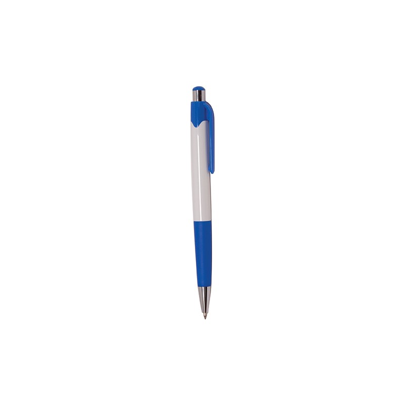 Kemijska olovka plastičnog bijelog tijela, klipsa i prstohvat u boji po izboru. Plavi ispis.