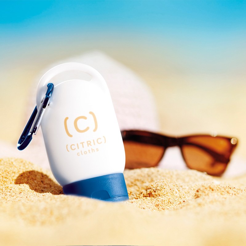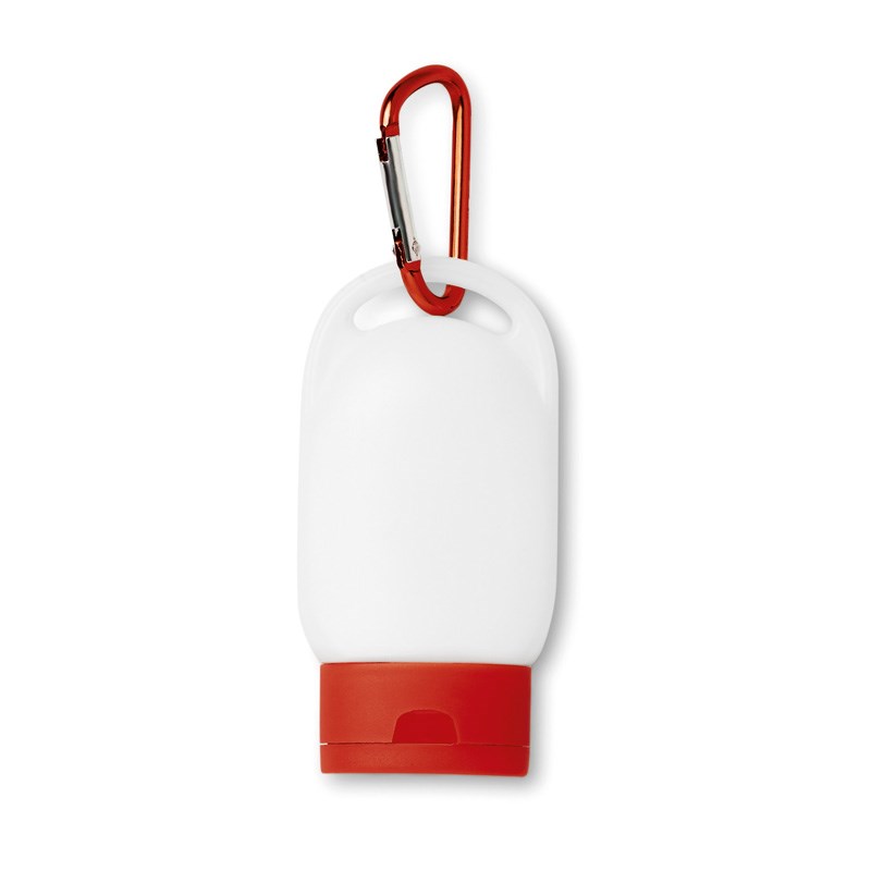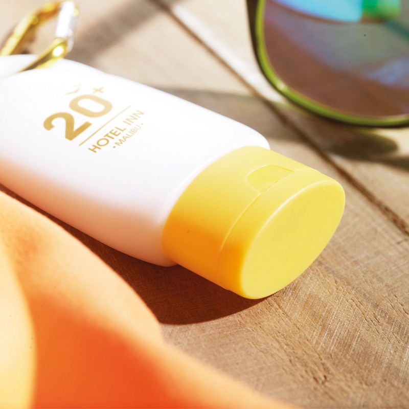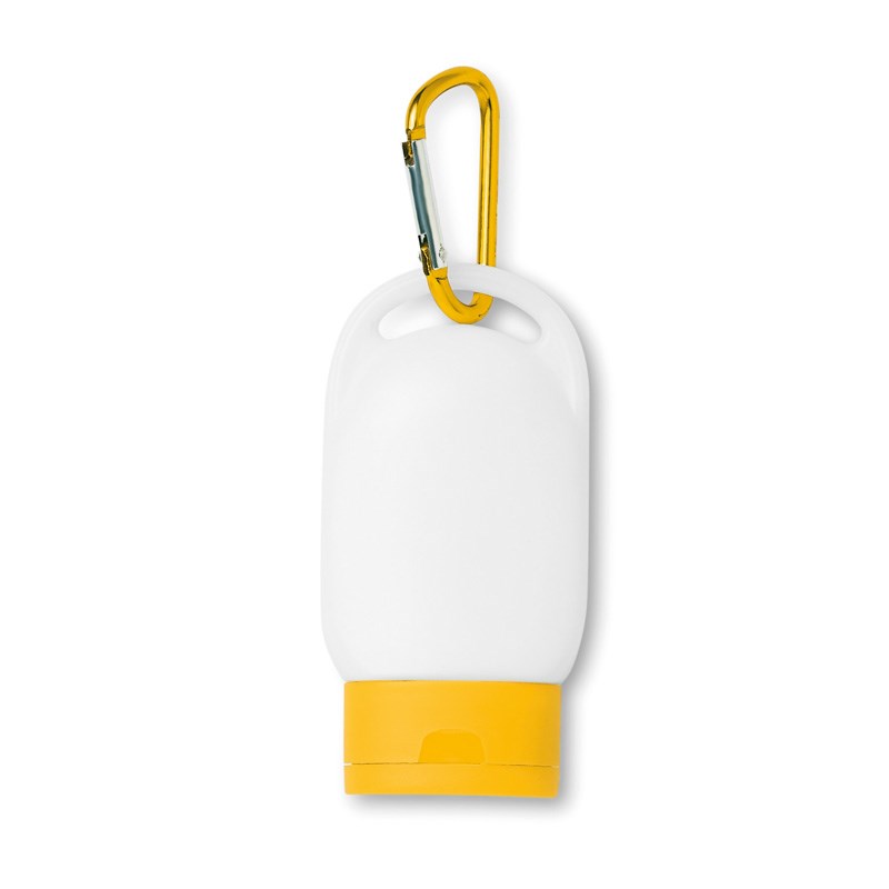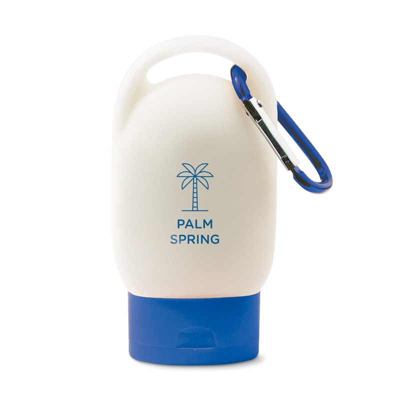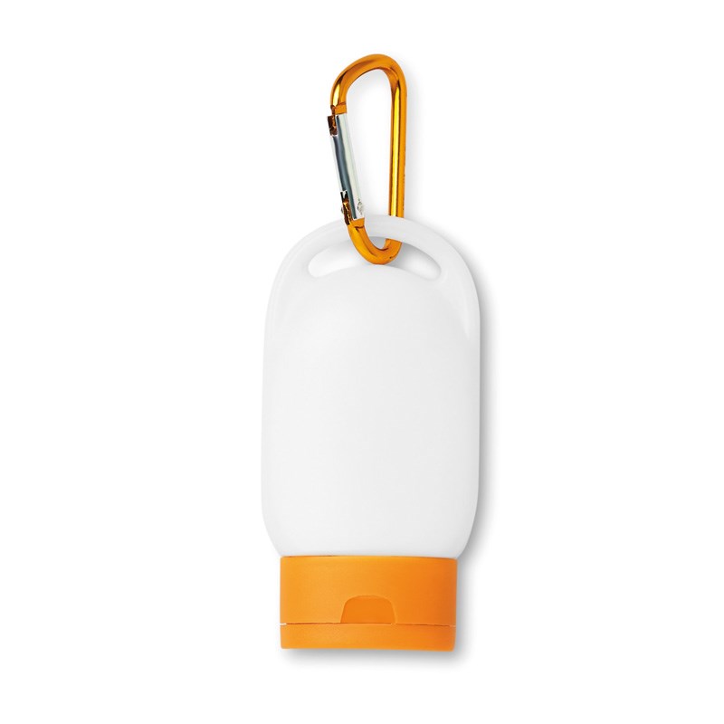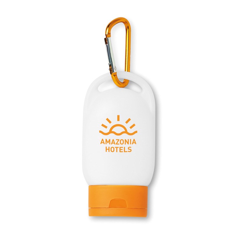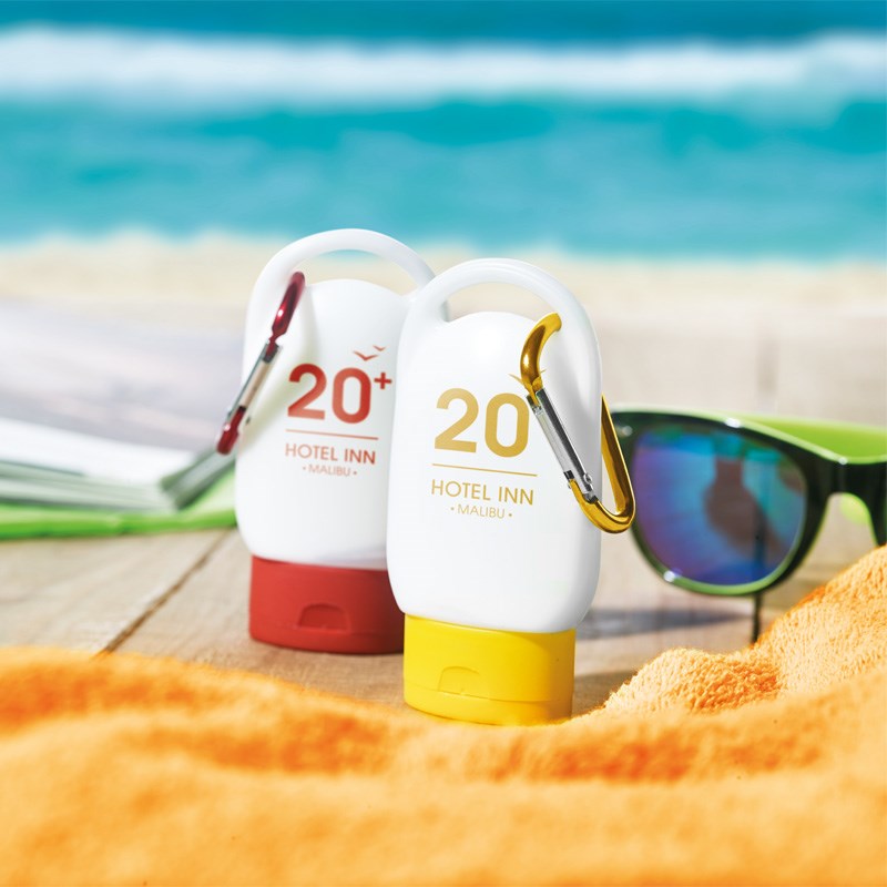 Losion za sunčanje sa SPF25 s karabinerom s mogućnošću personalizacije i izrade tiska. 30 ml.