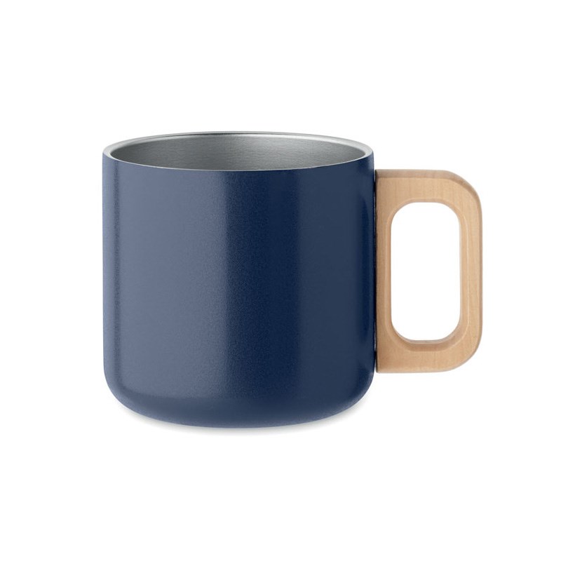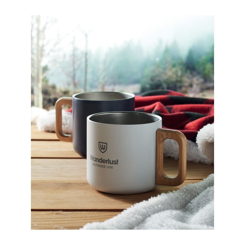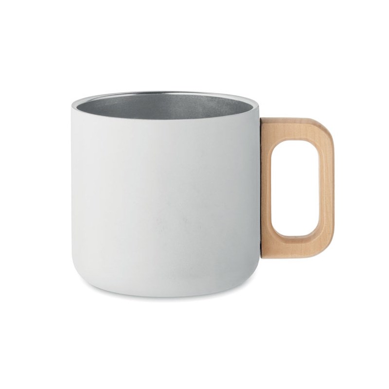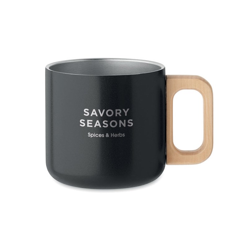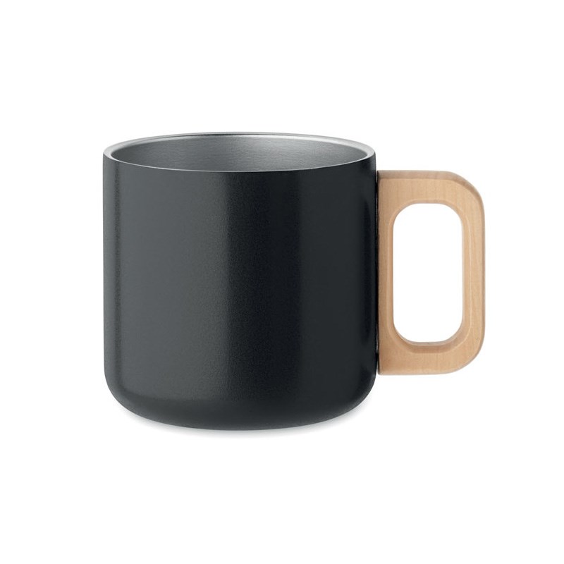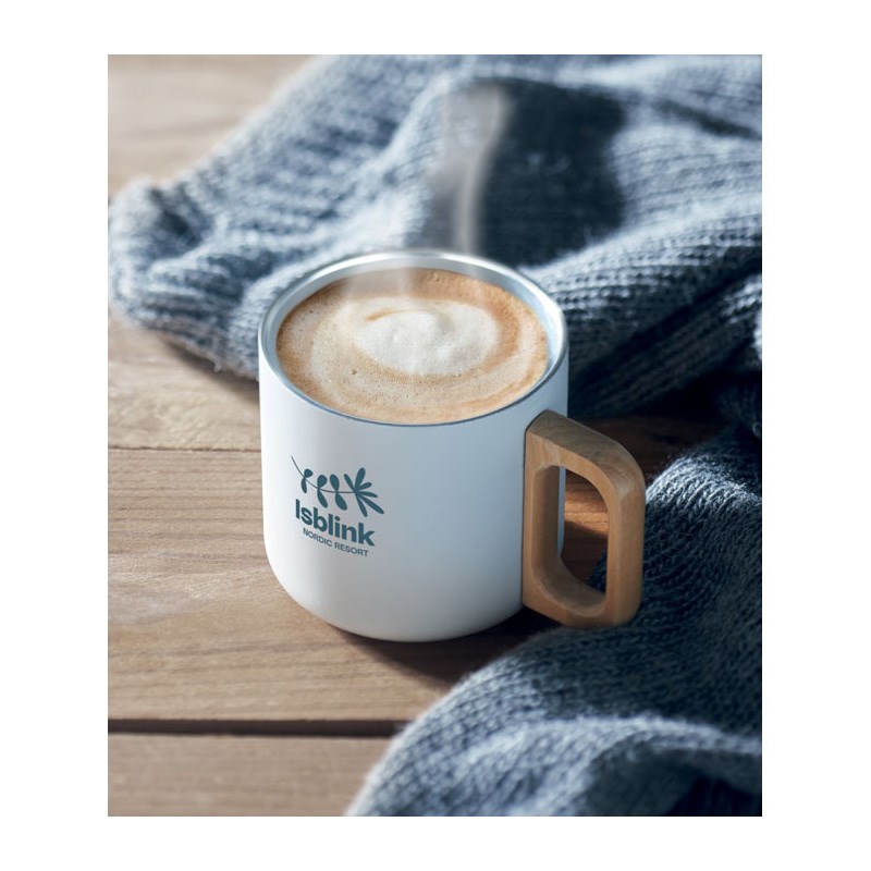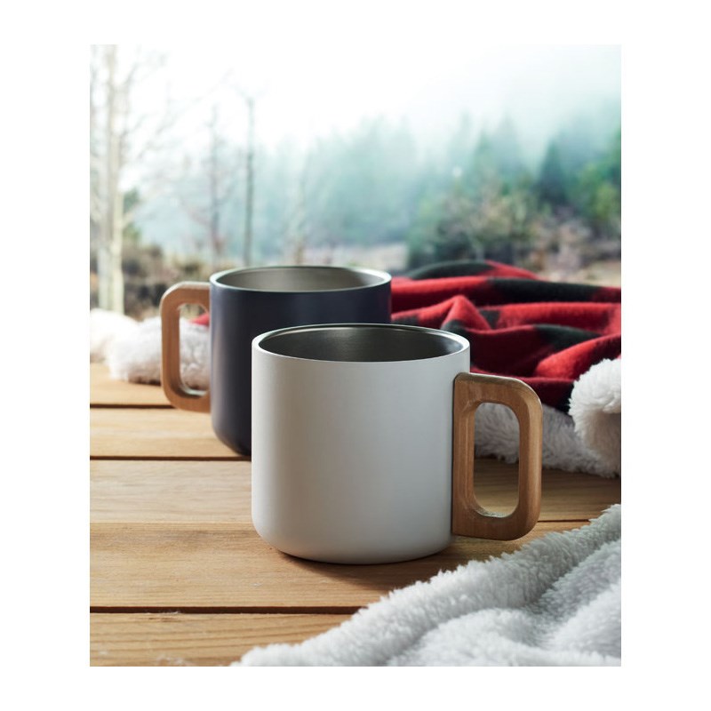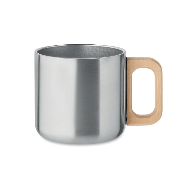 Šalica s dvostrukom stijenkom od recikliranog nehrđajućeg čelika s drvenom ručkom. Kapacitet: 350 ml.