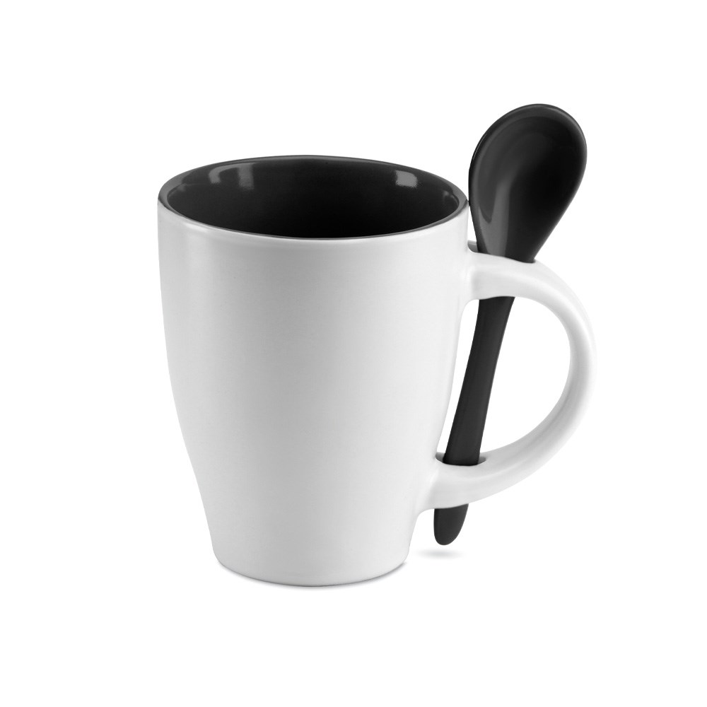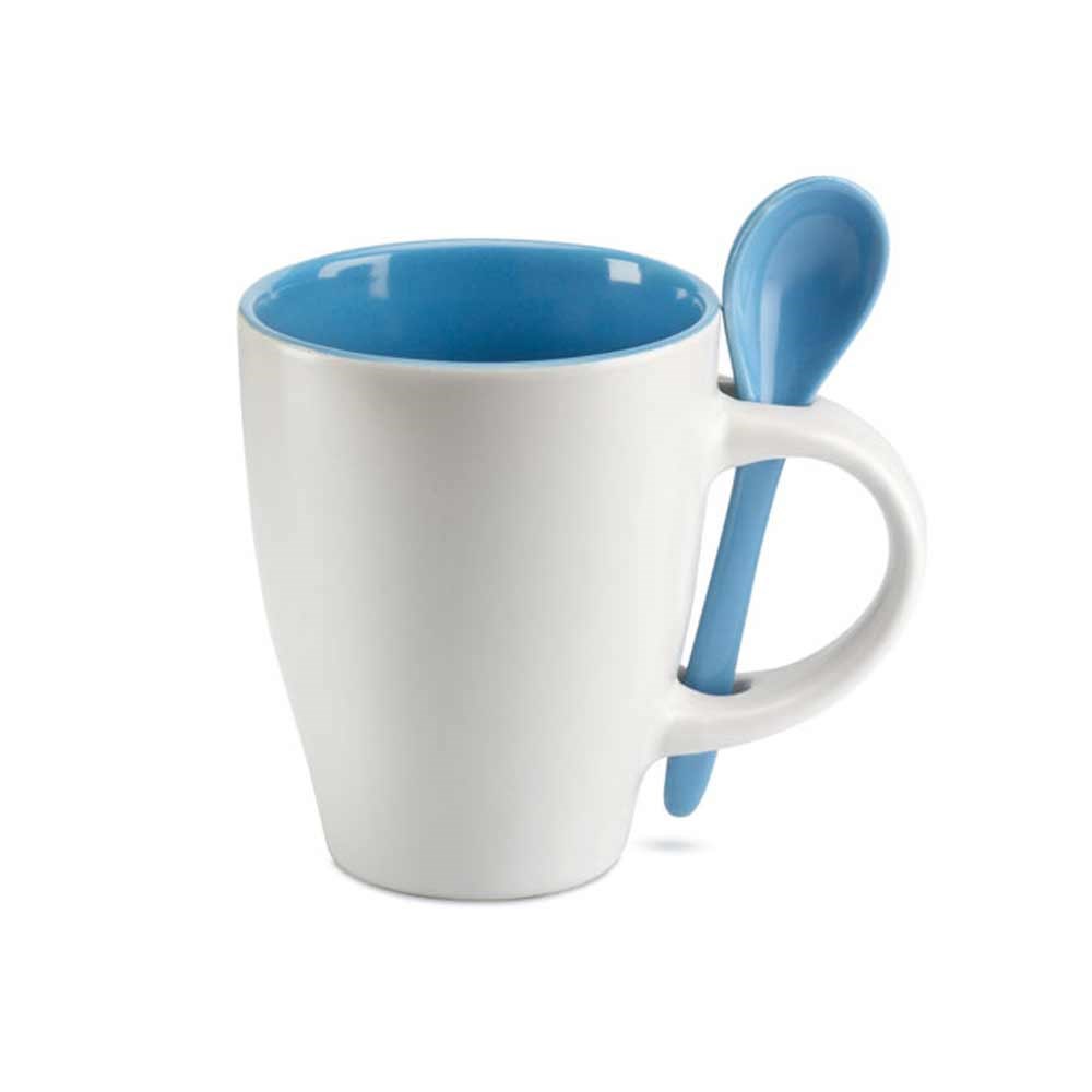 Dvobojna keramička šalica s žličicm u boji, 250 ml. Pojedinačna kartonska kutija 11,5x10,5x9,3 cm.