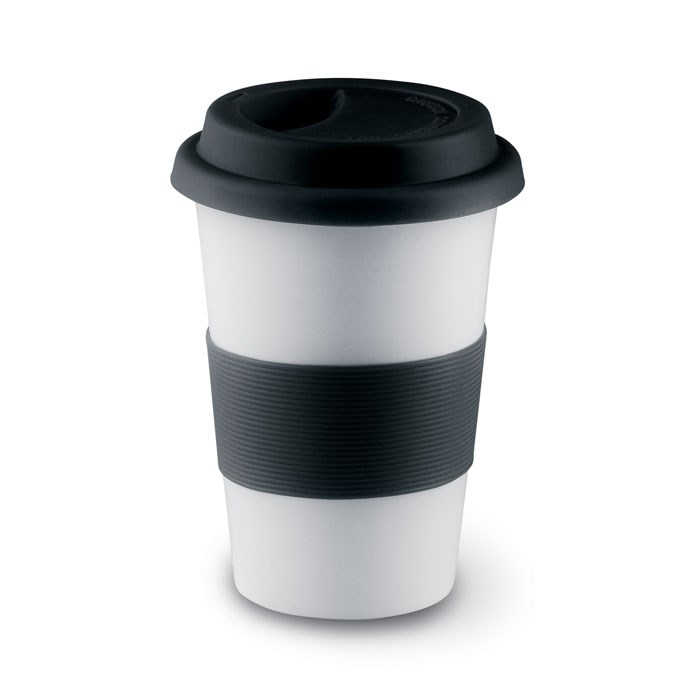 Keramička šalica sa silikonskim poklopcem i držačem. 400 ml. Nije pogodno za mikrovalnu. Keramički prijenos je održiv prilikom pranja u perilici.
